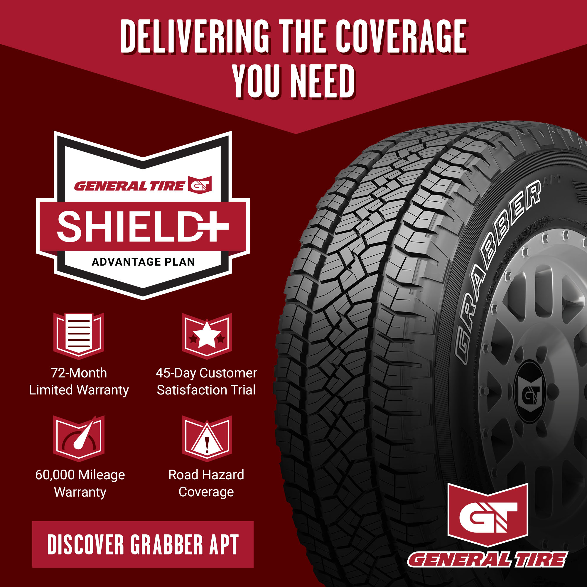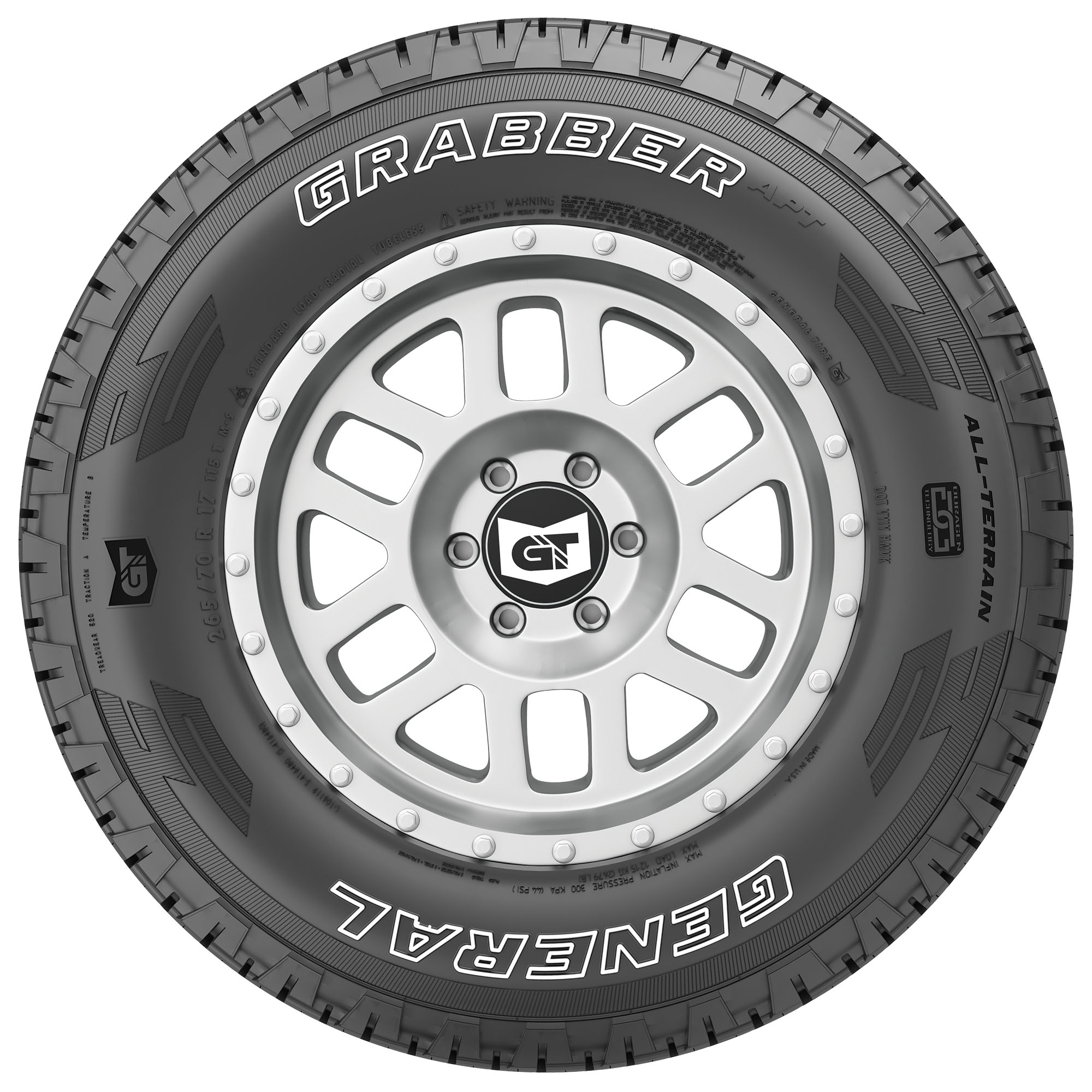The General Grabber APT is a durable, all-season all-terrain tire for light trucks, CUVs, and SUVs that is backed by up to 60,000-miles of limited manufacturer tread life coverage. Built for on-road performance and off-road traction, the Grabber APT features General's Duragen Technology that enhances strength and durability, delivers cut-and-chip resistance, and extends tread life.