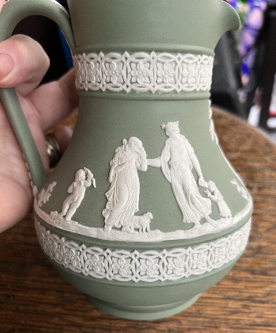 We are offering an antique Wedgwood jasperware 6” x 5" at the widest Etruscan jug in sage green. This piece is classically Victorian in the style of Greco-Roman revival, with a pastoral scene of cherubs and maidens wrapping around the middle and bordered on the top and bottom by a geometric floral design. The inside of the jug is glazed while the outside is not. This piece is the perfect addition to any collection.