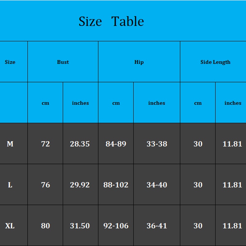 XL: waist: 31.50 in/80 cm; hip: 36.22-41.73 in/92-106 cm; side length: 11.81 in/30 cm