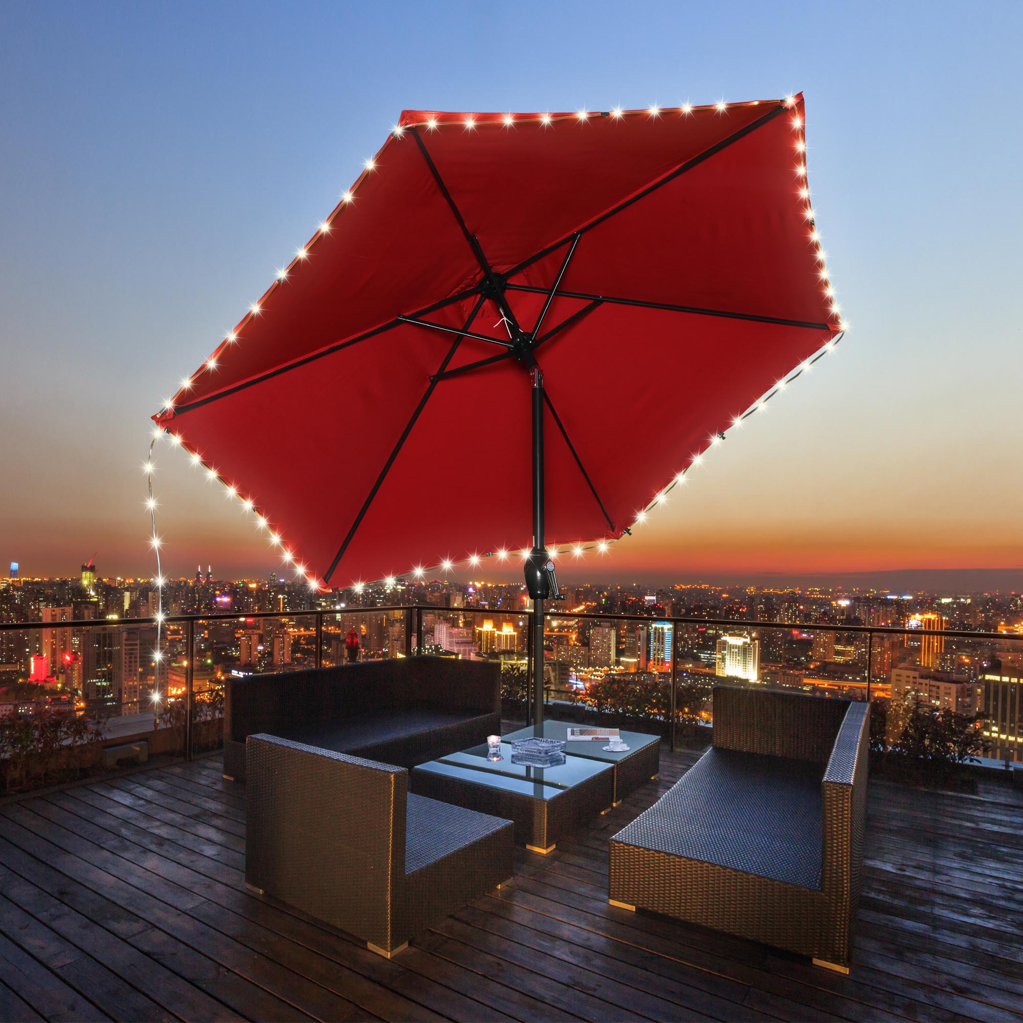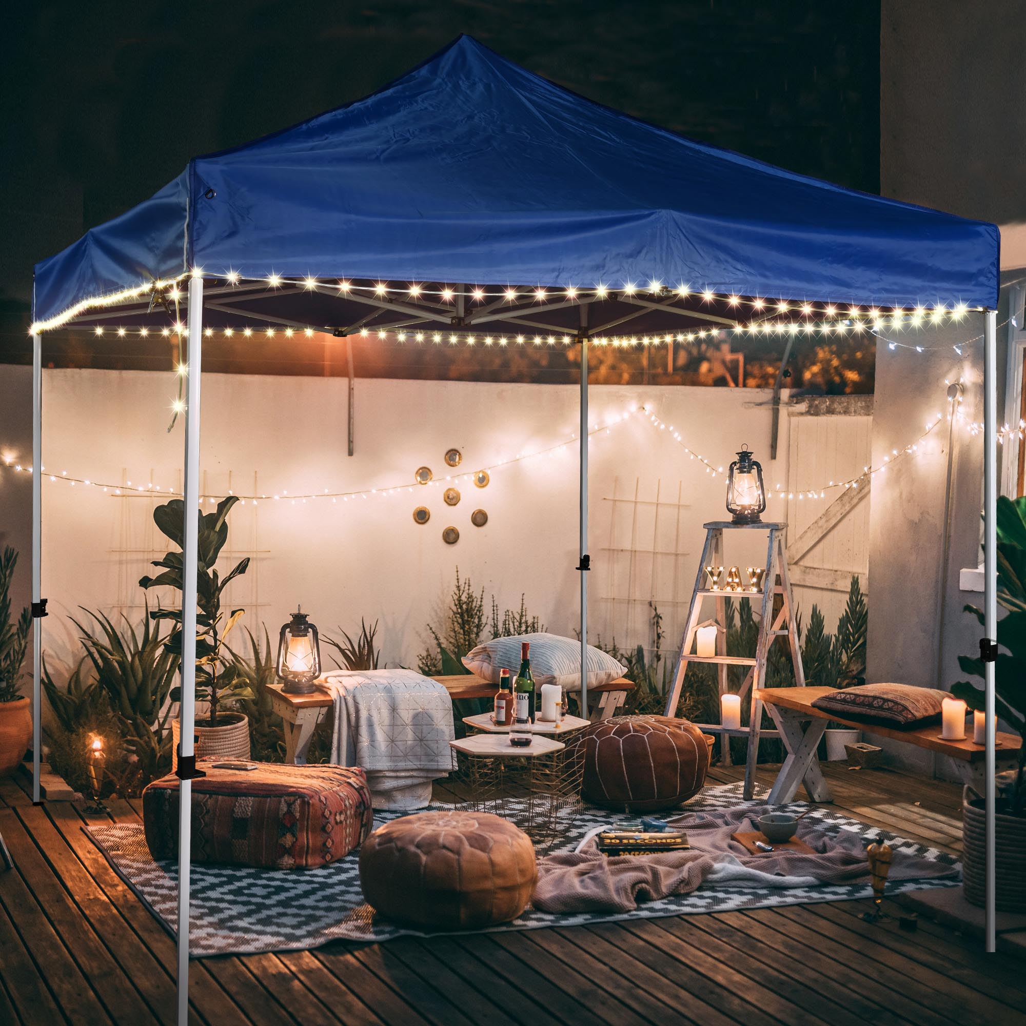 40 ft Solar Powered LED String Light for 10x10 ft canopies features a solar panel to charge at daytime and automatically turn on lights at night, an energy-efficient decoration for your backyard and patio. It comes with 8 flashing modes for setting the desired mood for any event such as barbeque, wedding and parties.
