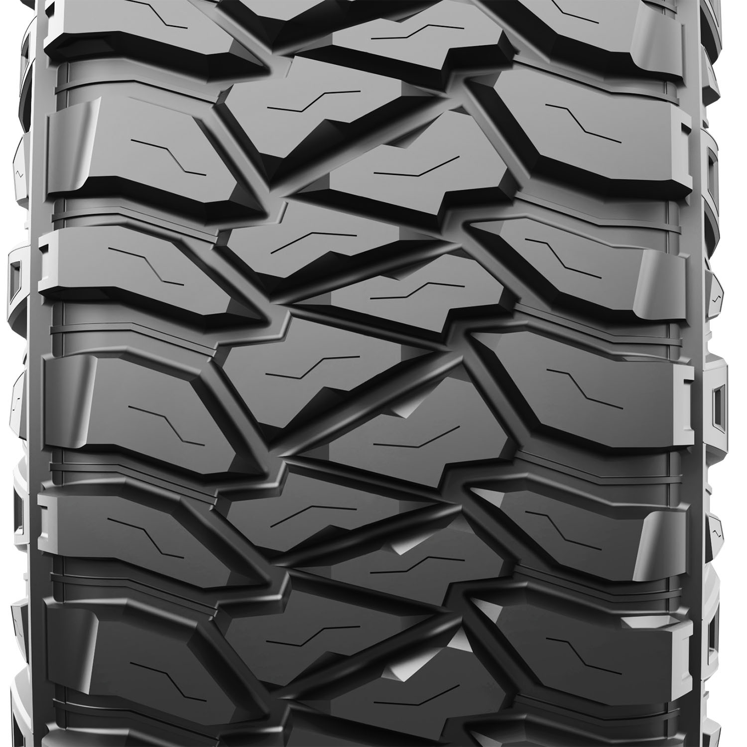 • Self-cleaning high-void tread pattern and angled shoulder scallops provide additional off-road traction