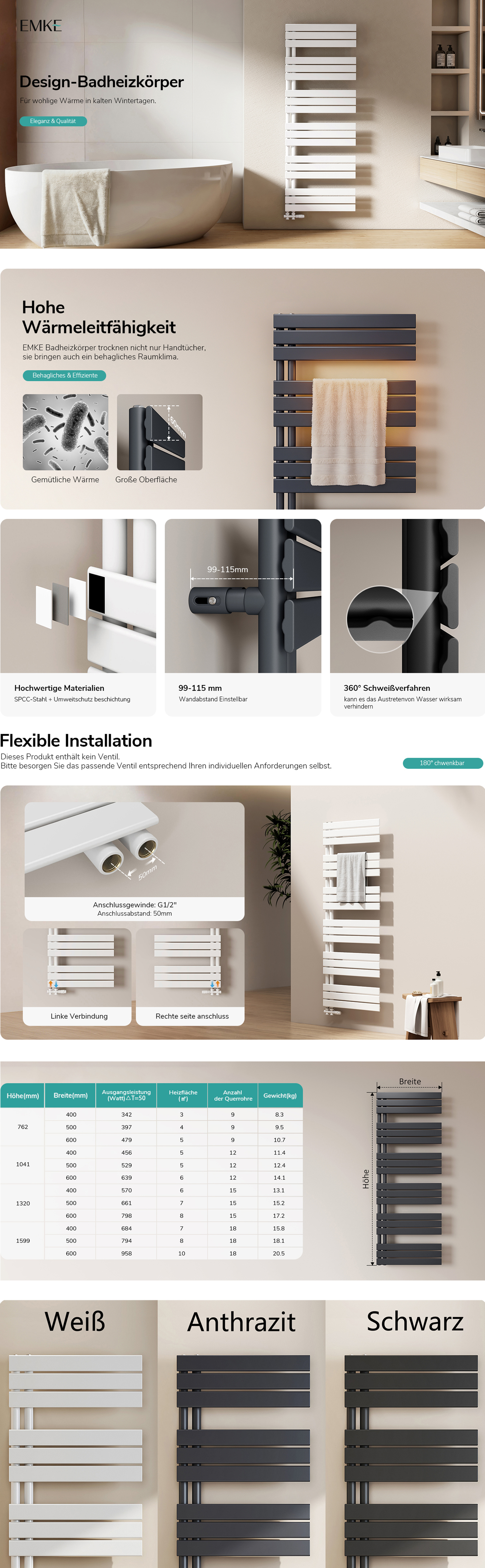 3. Hochwertige Verarbeitung: Dank unsichtbarer Schweißnähte, ist der Handtuchwärmer nicht nur einfach zu reinigen, sondern verfügt auch über eine Schöneres Aussehen.
