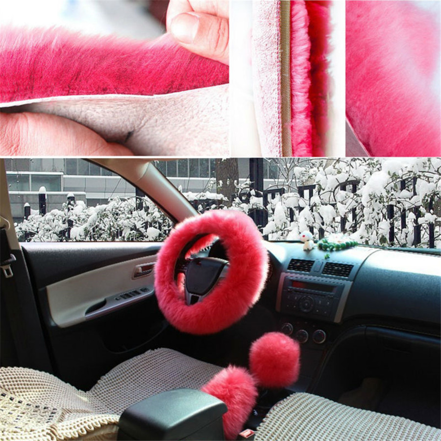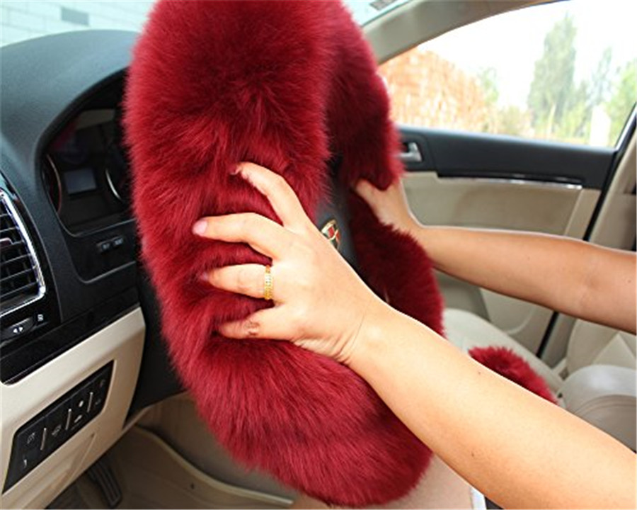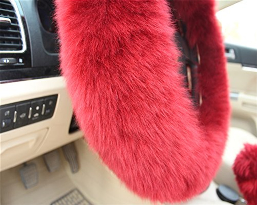 3Pcs Fur Wool Furry Fluffy Thick Car Steering Wheel Cover Red Wine Color Winter