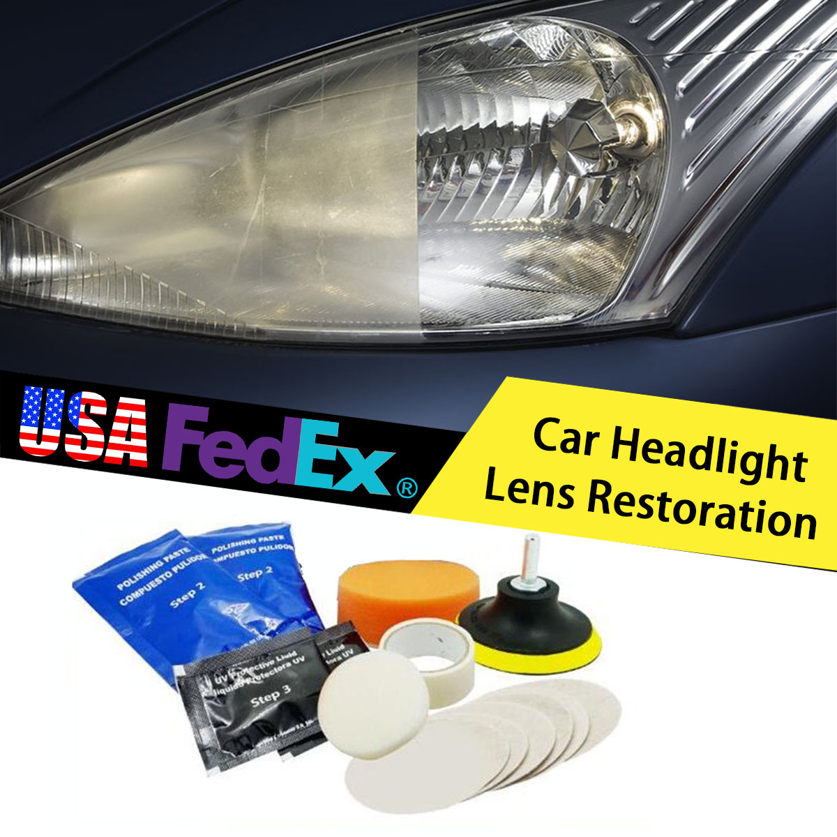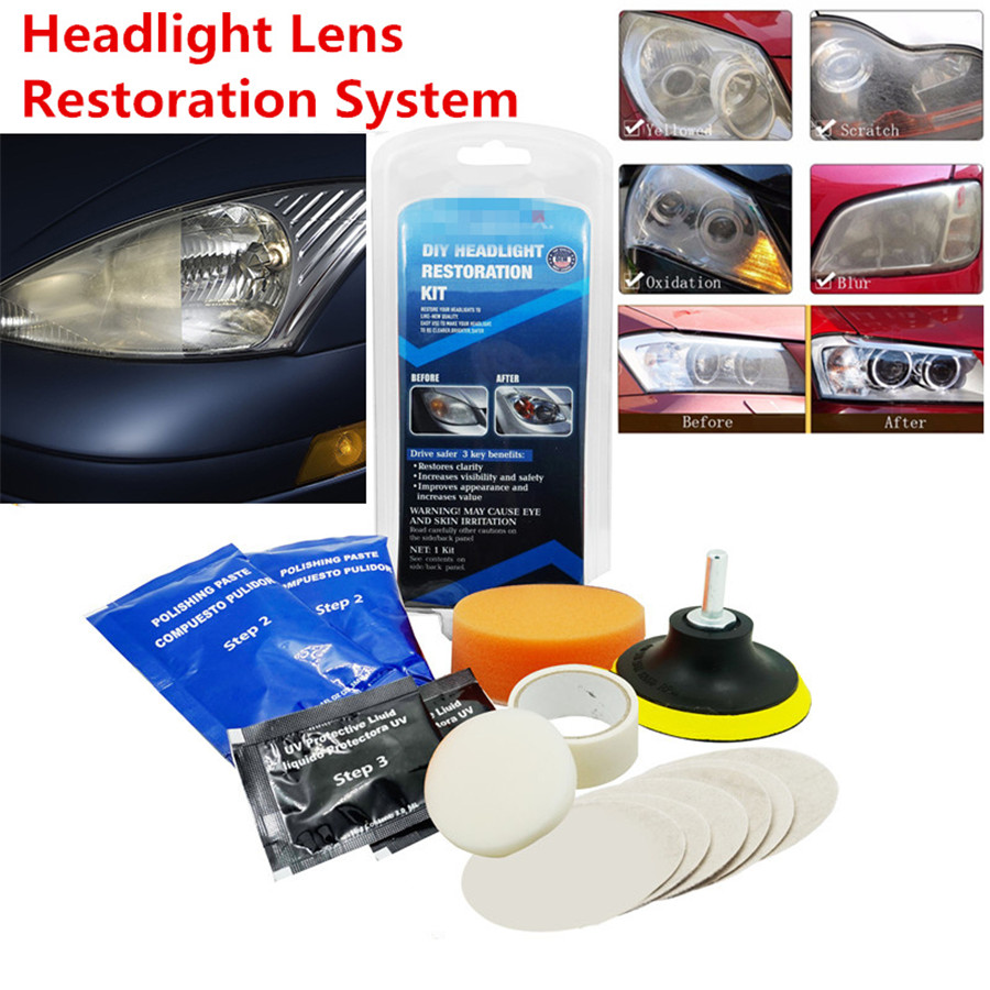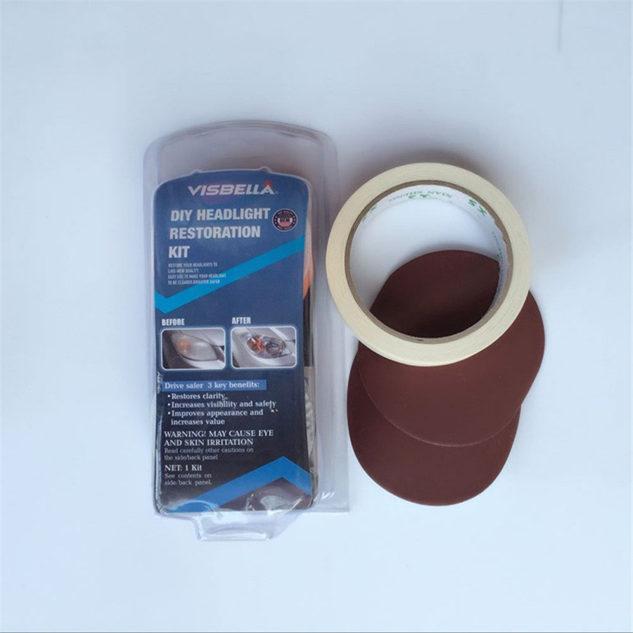 Plastic lenses can yellow with age, reducing headlight brightness, and new lenses can be expensive. The Headlight Lens Restoration Kit lets you shine and restore plastic lenses, including headlights, taillights, fog and directional lights. By restoring clarity to the lens, the performance of the headlight is improved and the appearance of the vehicle is enhanced Now you can produce professional results with the Headlight Lens Restoration Kit. Kit includes all items necessary to perform the task except for the masking tape.