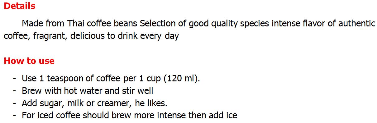 | | | Khao Shong Black Essence Thai Coffee diet Instant Coffee Intense 100g | Shipping Details: - The item will be shipped worldwide next business day after the money has been transferred to my Paypal account and you should received in 2-4 weeks. The item will be posted by airmail from Thailand in well package and send by Non-Registered airmail.