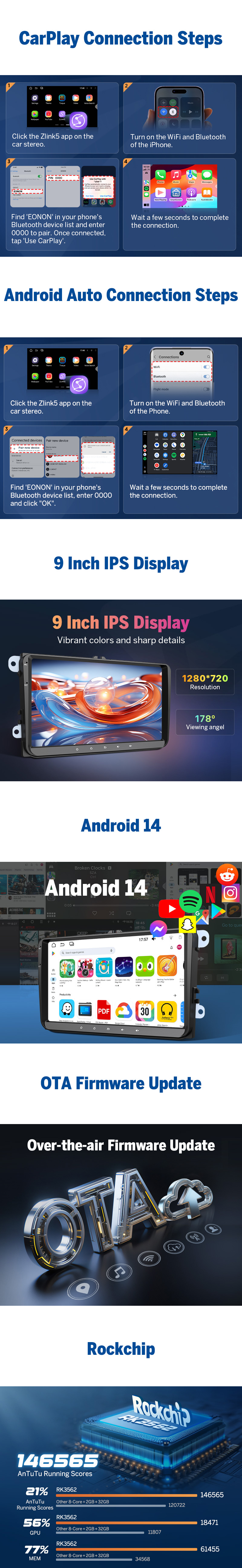 4GB RAM + 64GB ROM | Wireless Apple CarPlay & Android Auto | 9" IPS HD Touchscreen | DSP Audio | Built-in GPS | WiFi 6 | Bluetooth 5.4 | OTA Updates