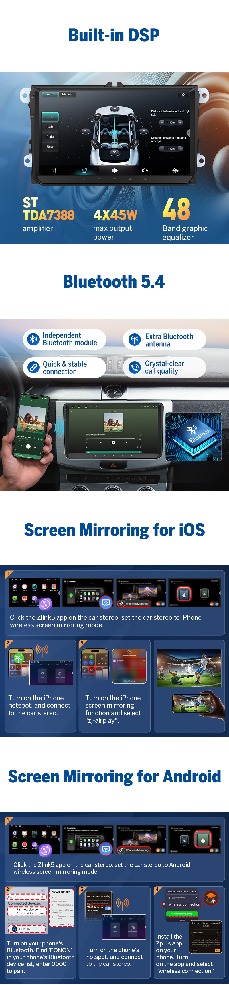 β Excellent. 48-band DSP + TDA7388 amplifier delivers superior clarity and bass compared to standard aftermarket units.