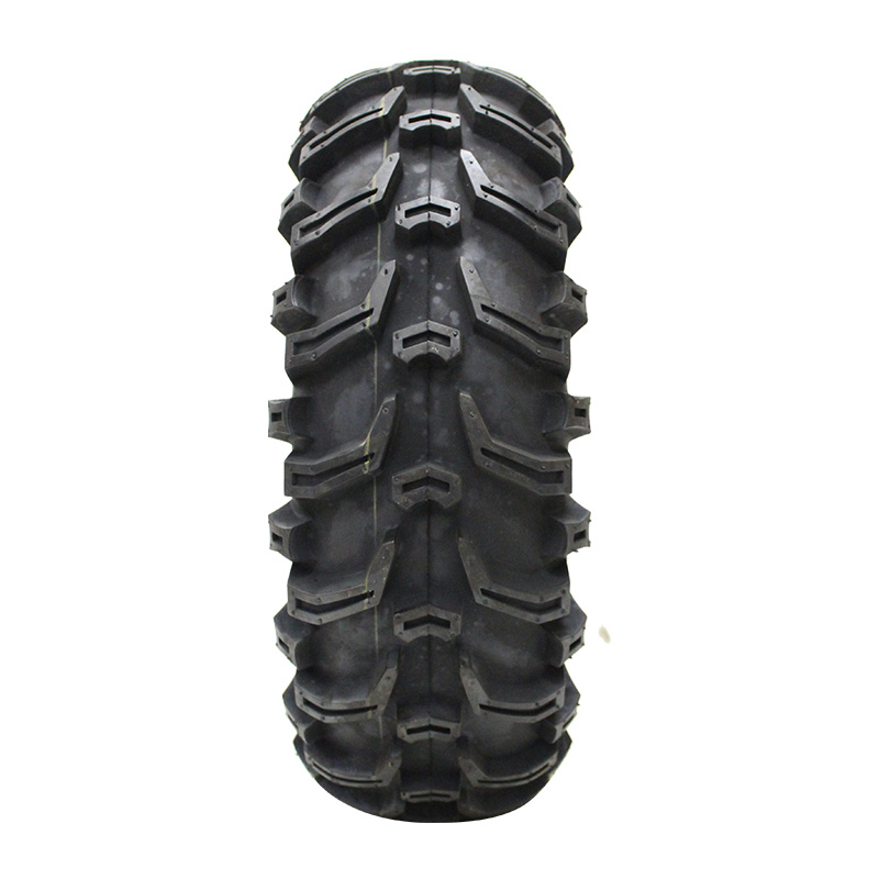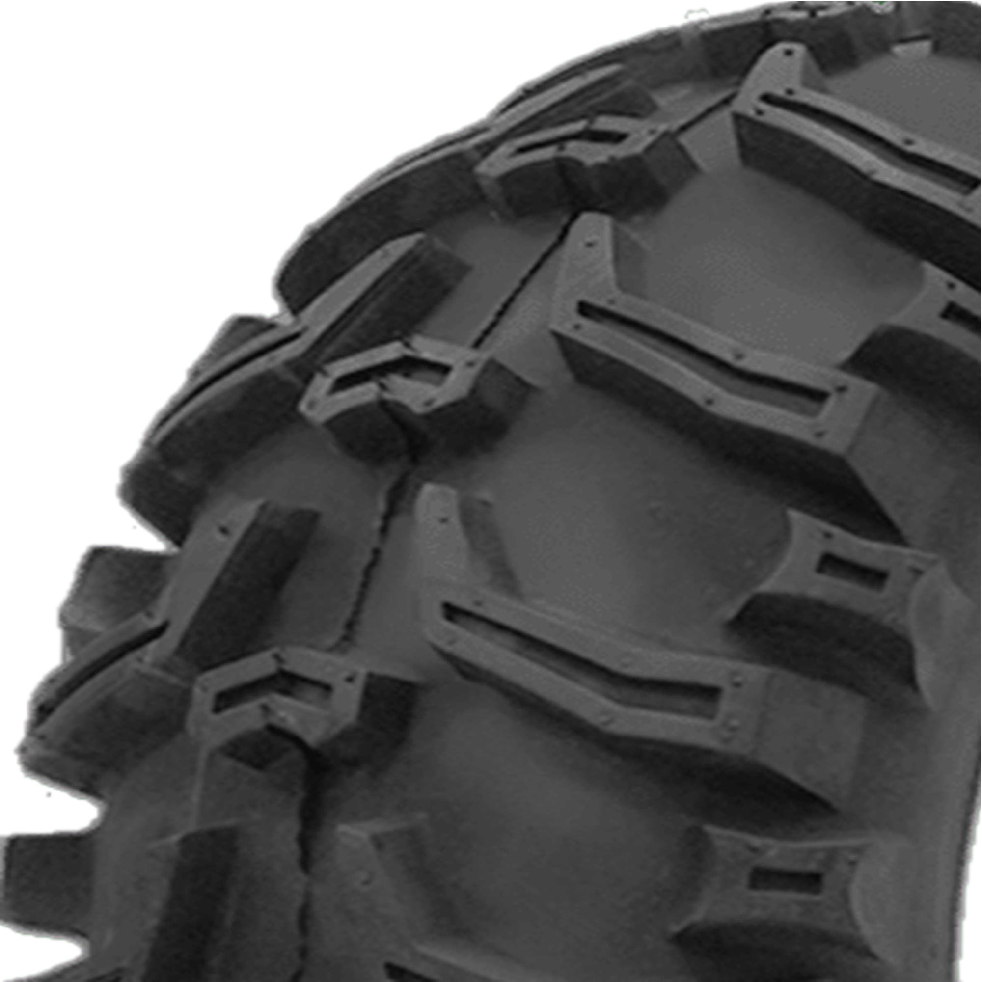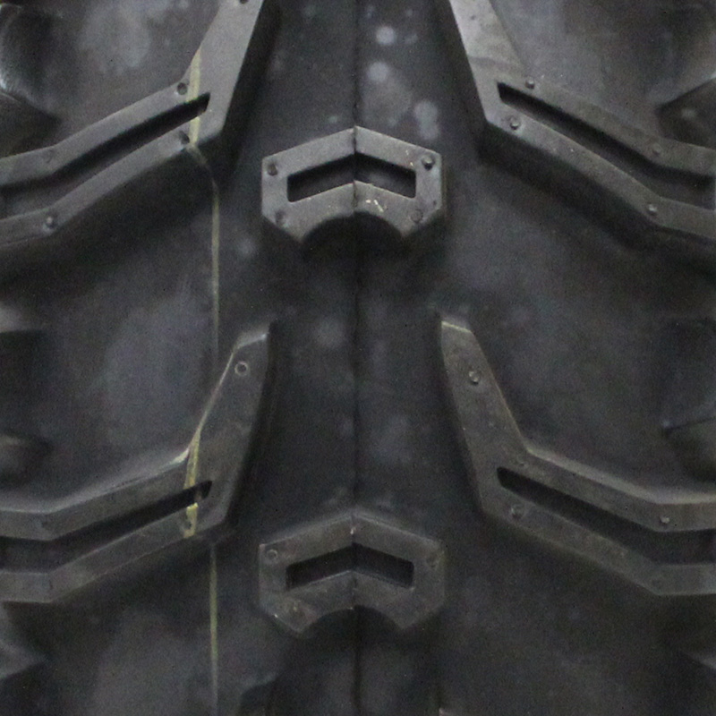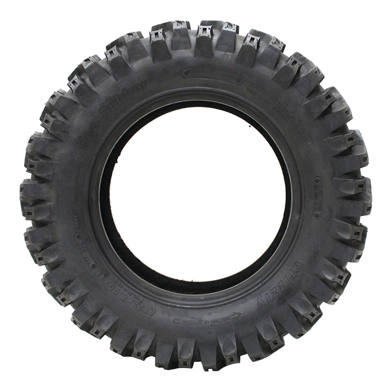 Vee Rubber's Grizzly ATV/UTV tire is designed with a chevron tread pattern and dimpled lugs for traction. The chevrons help dig in on soft surfaces and mud, while the stud at the center of each chevron offers stability and traction on hard-packed surfaces. The lugs wrap around onto the shoulder and sidewall to help dig out of ruts, while a 6-ply construction reinforces the sidewall for added durability.