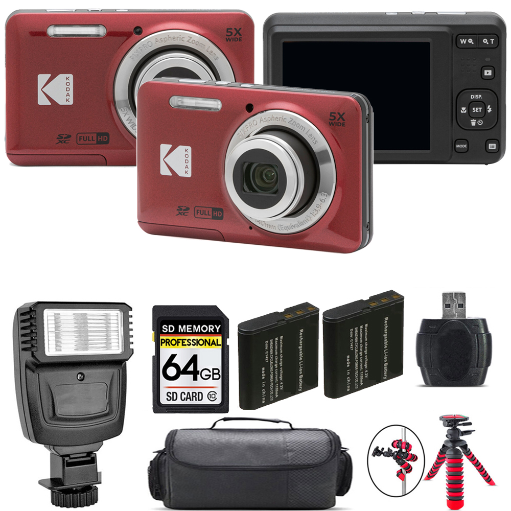 Kodak PIXPRO FZ55 Digital Camera (Red) + Extra Battery + Flash - 64GB Kit