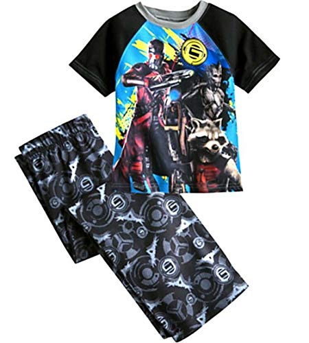 He'll be sure to love the vivid 3D graphic of some of his favorite superheroes along with the comfort of the soft polyester fabric. Features Star-Lord, Groot and Rocket Raccoon in colorful graphics. Raglan style black short sleeves and a gray rib-knit collar. Coordinating print pajama pants with an elasticized waistband for a custom fit. Of a soft polyester jersey fabric.