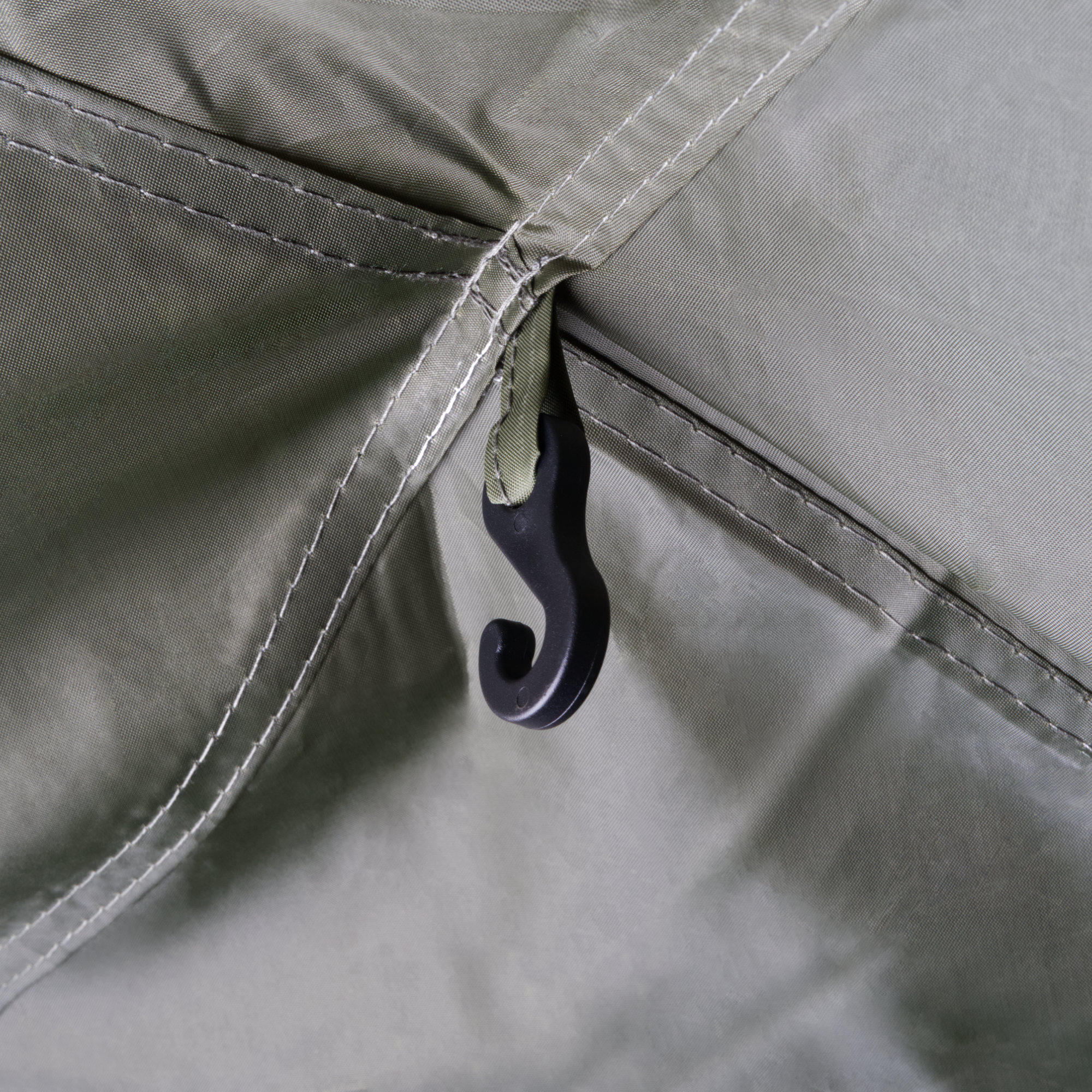 Das Anglerzelt besteht aus 210D Polyester, hat eine 2000 mm Wassersäule und ist PU-beschichtet, sodass der Zeltstoff wasserabweisend ist. Der fest vernähte Boden besteht aus PVC, welches den Boden feuchtigkeitsbeständig und rutschfest macht.