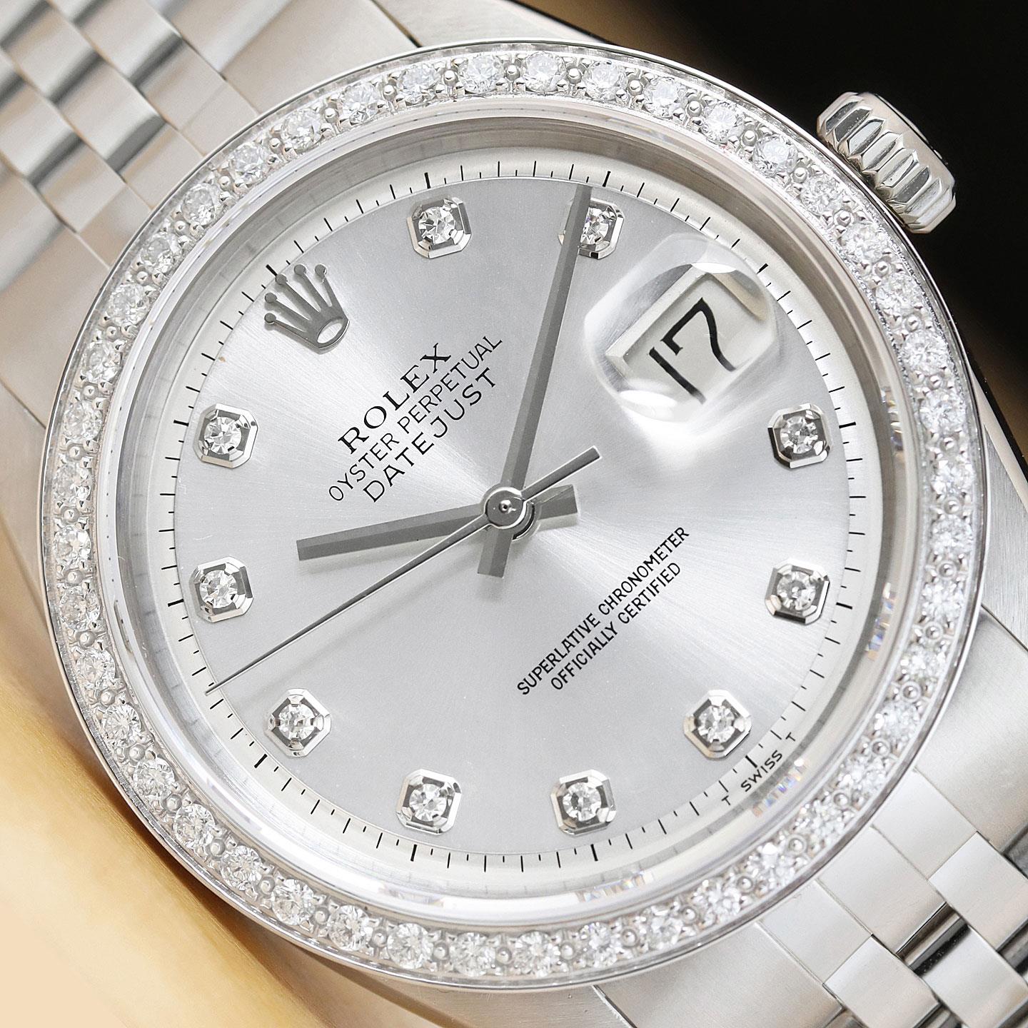 ROLEX MENS DATEJUST SILVER DIAL 18K GOLD STEEL DIAMOND WATCH w/ FOLDED BAND
