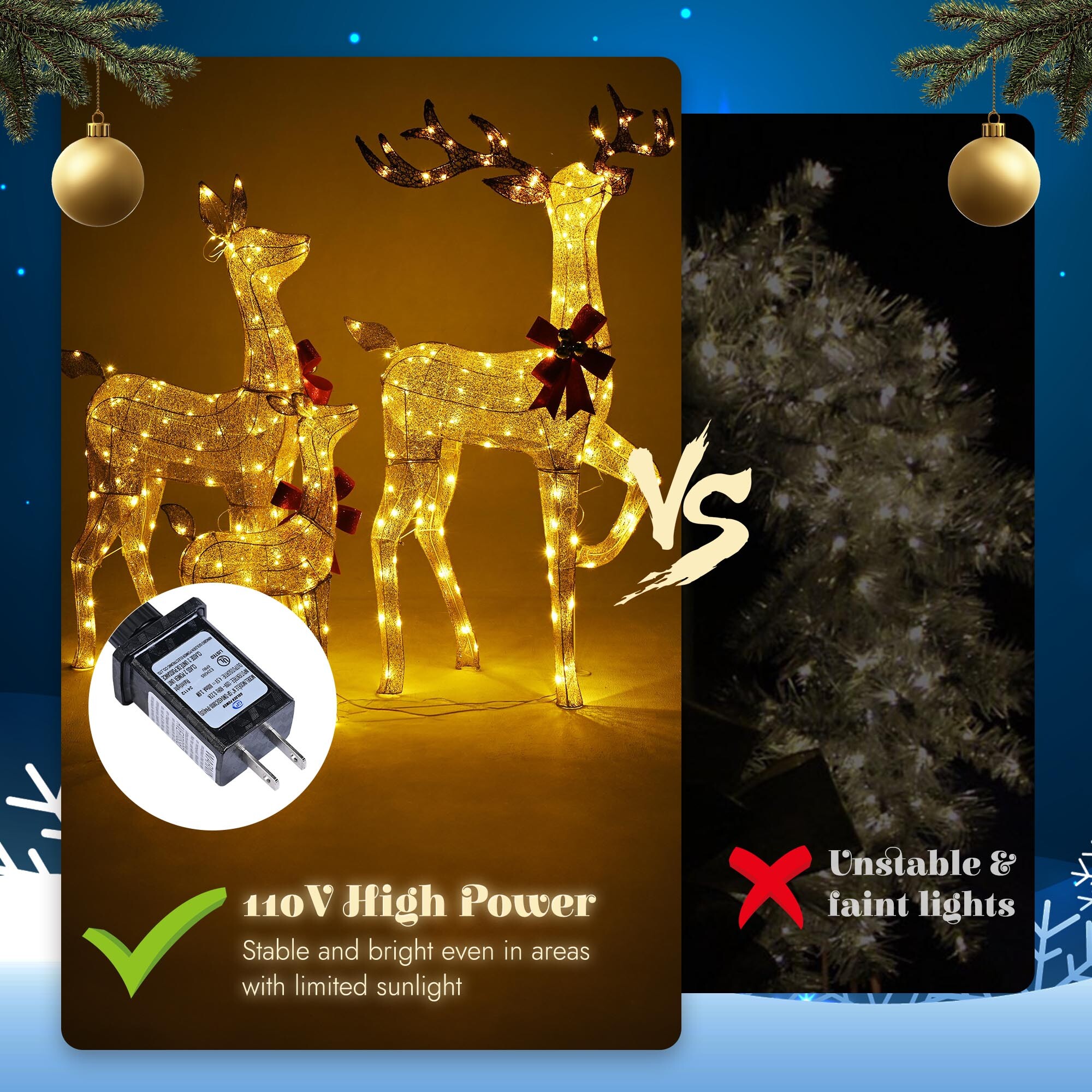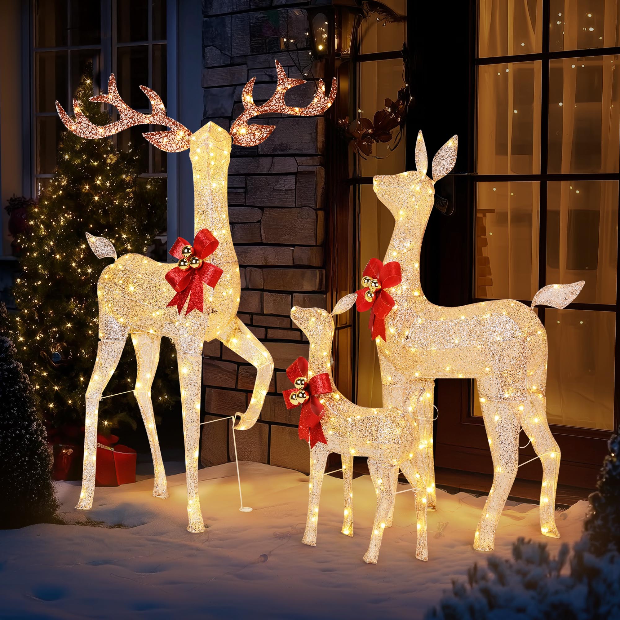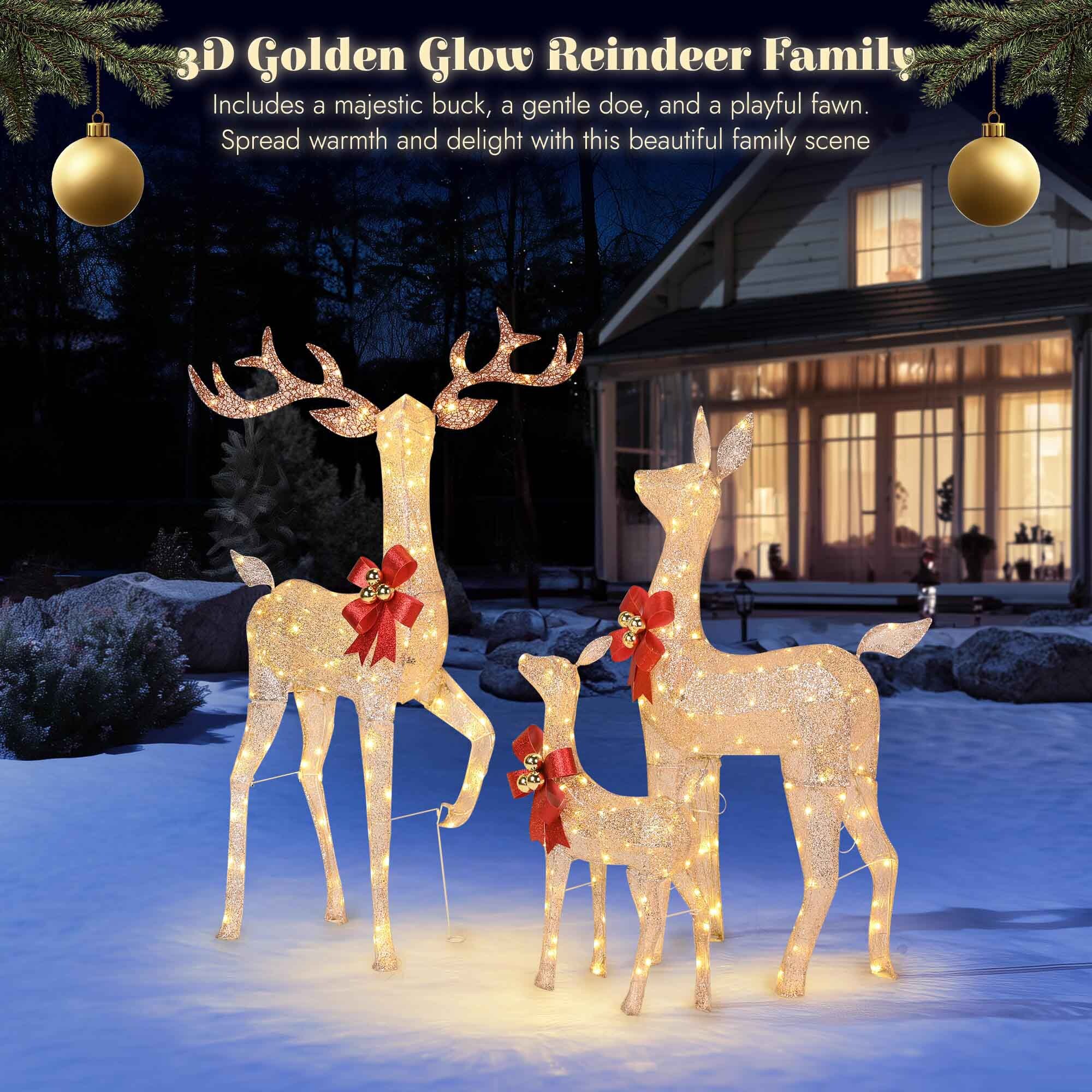 - Golden Glow of Deer Family - This 3-Piece Lighted Reindeer Family greets your guests with an enchanting display of holiday cheer. The golden glitter finishes with warm white lights, adds a touch of elegance and warmth to your outdoor space, showcasing your exquisite taste and festive spirit