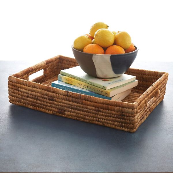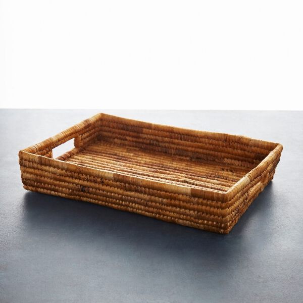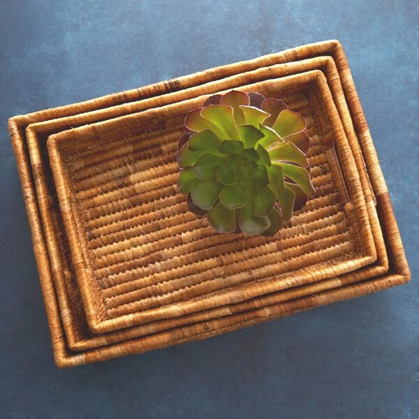 * Large size tray * Rectangular shape * 16" length, 12" width, 3" height * Brown and black color * Handwoven from banana stalks and leaves * Sustainably produced * Made in Rwanda --------------------------------- Thousand Bananas is our collection of handwoven banana stalk and banana leaf products from Rwanda. Rwanda, the country in central east africa is filled with mountains and is popularly known as - The Land of Thousand Hills. Thousand Bananas is a nameplay on banana leaves and the land of thousand hills. Green Bananas is one of the main crops of Rwanda. Green Bananas occupy more than a third of the country's farmland. After the bananas are harvested, the waste produced from farming such as leaves and stalks are used to produce Thousand Bananas baskets and trays. Our baskets are woven by a womens cooperative group in Nyaruguru District. The co-operative consists of 30 members and they weave together in a local school yard. The cooperative has provided the women with financial independence and also as a support group to rely on each other for advice.