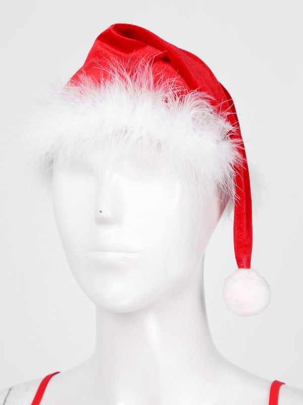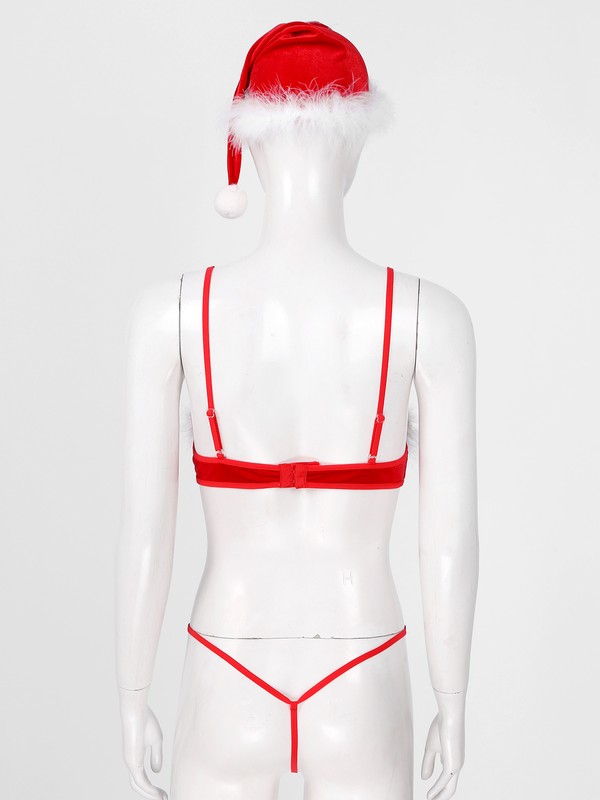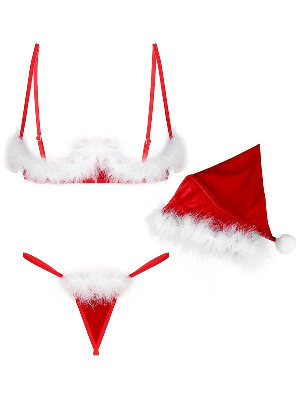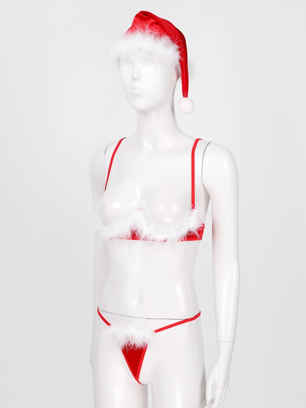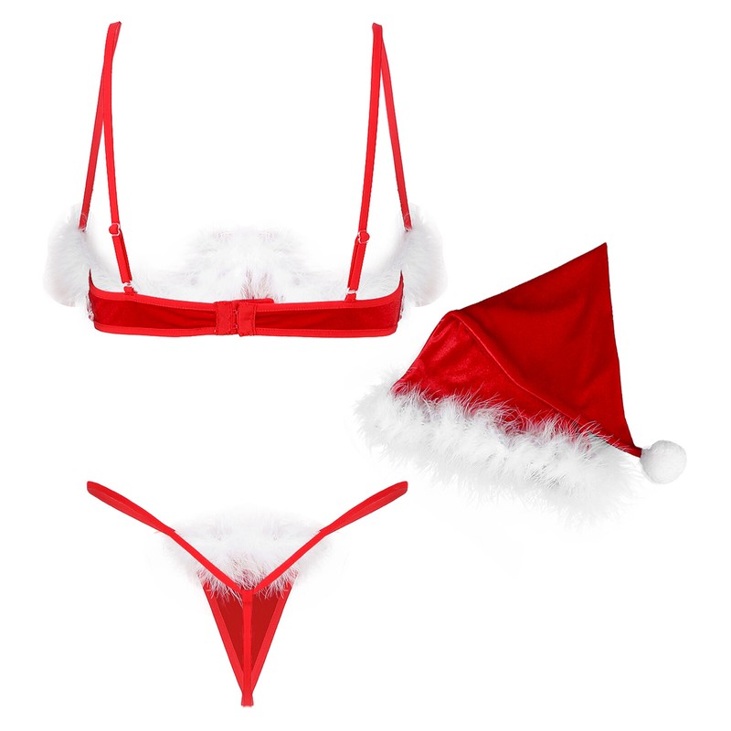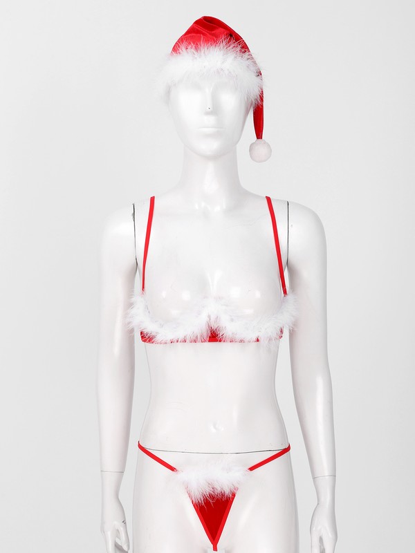 Women Feather Trimming Lingerie Suit Christmas Underwear Bra G-string Hat.