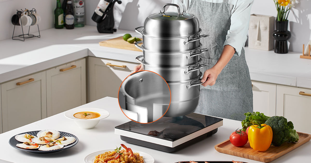 Steaming is a healthy way of cooking vegetables, dumplings, rice, and fish without losing any of the goodness. You can enjoy nutritious and delicious food with this stainless steel steamer. It is made from 304 food-grade stainless steel, with a three-layer composite bottom, making it suitable for all hob types, including gas, ceramic, halogen, etc. This superior steamer set has five steamer tiers, providing a larger cooking space for you.