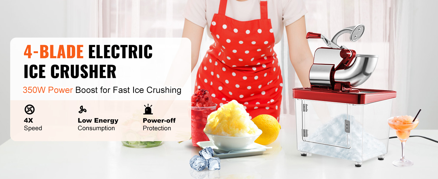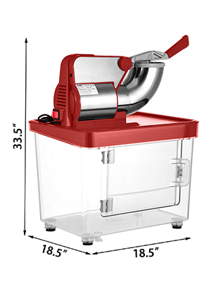 Our electric ice shaver features an eyes-pleasing appearance and powerful performance. With the built-in 300W copper motor, it can crush 396.8 lbs (180 kg) of ice each hour, providing you with soft, fluffy, and powdery snow ice and meeting your demands in a relatively short time. Considerate design details and accessories are also integrated, such as the integrated storage box, wide ice inlet, ergonomic handle, waterproof switch, non-skid feet, etc. It is perfect for restaurants, canteens, bars, cafés, snack stands, etc.