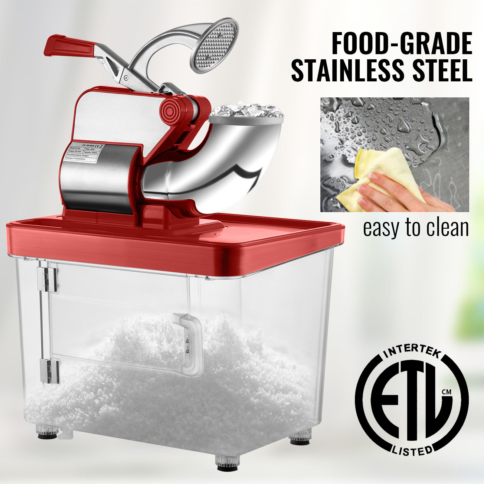Our snow cone machine adopts dual stainless-steel blades, sharp and durable, providing double shaving efficiency. The amount of crushed ice per hour can reach 396.8 lbs (180 kg). And an extra set of blades is included for replacement.