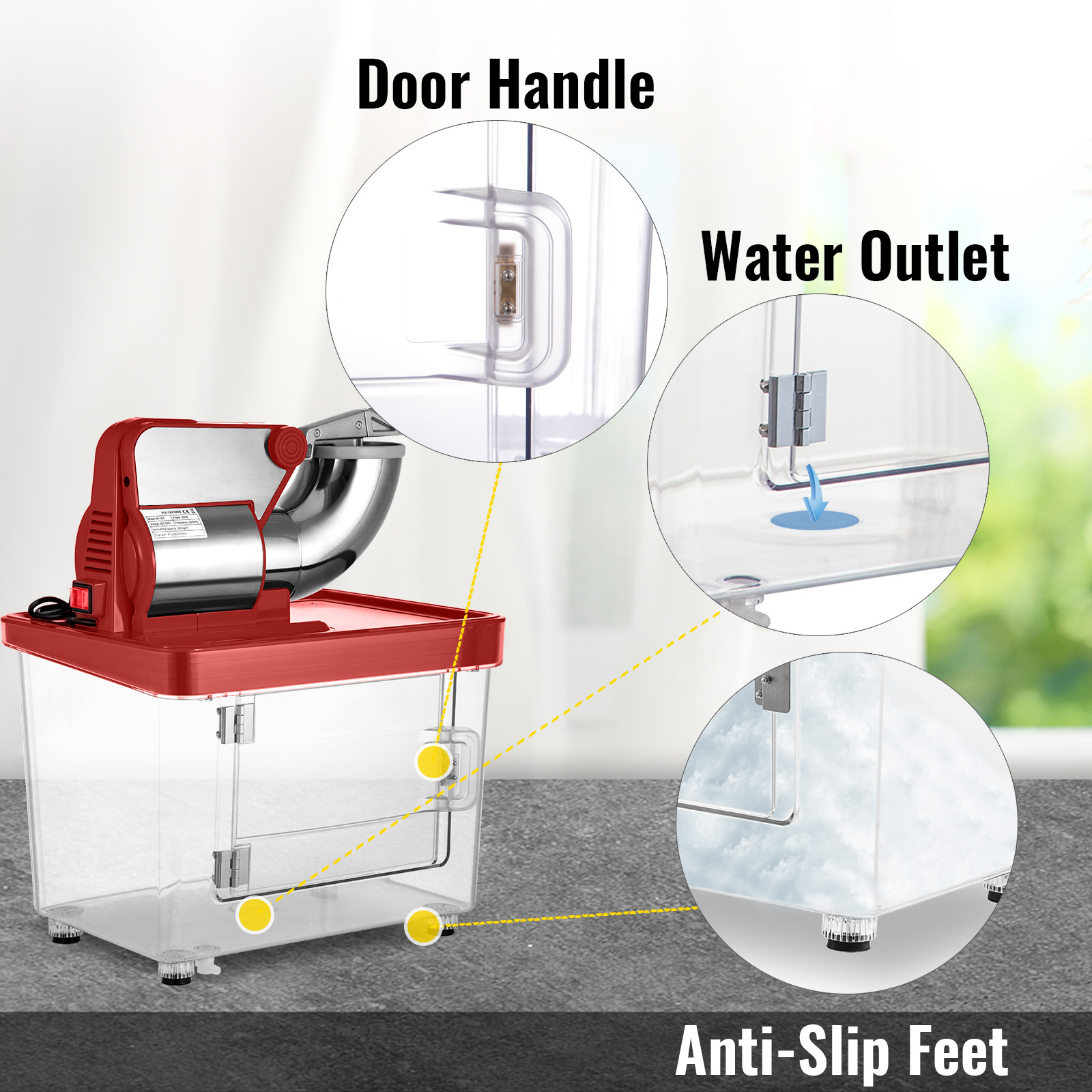 The door handle is convenient to open and take out the shaved ice. The water outlet below serves to discharge the melted ice timely. And the non-slip feet will stabilize the machine during working.