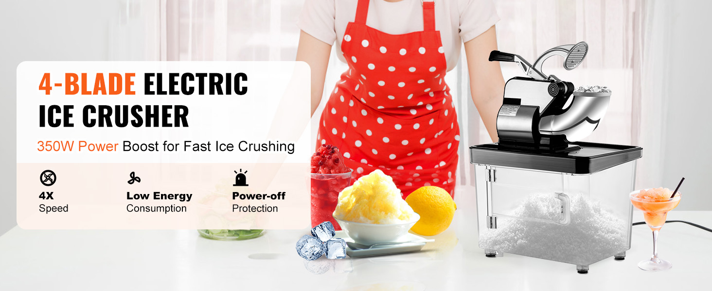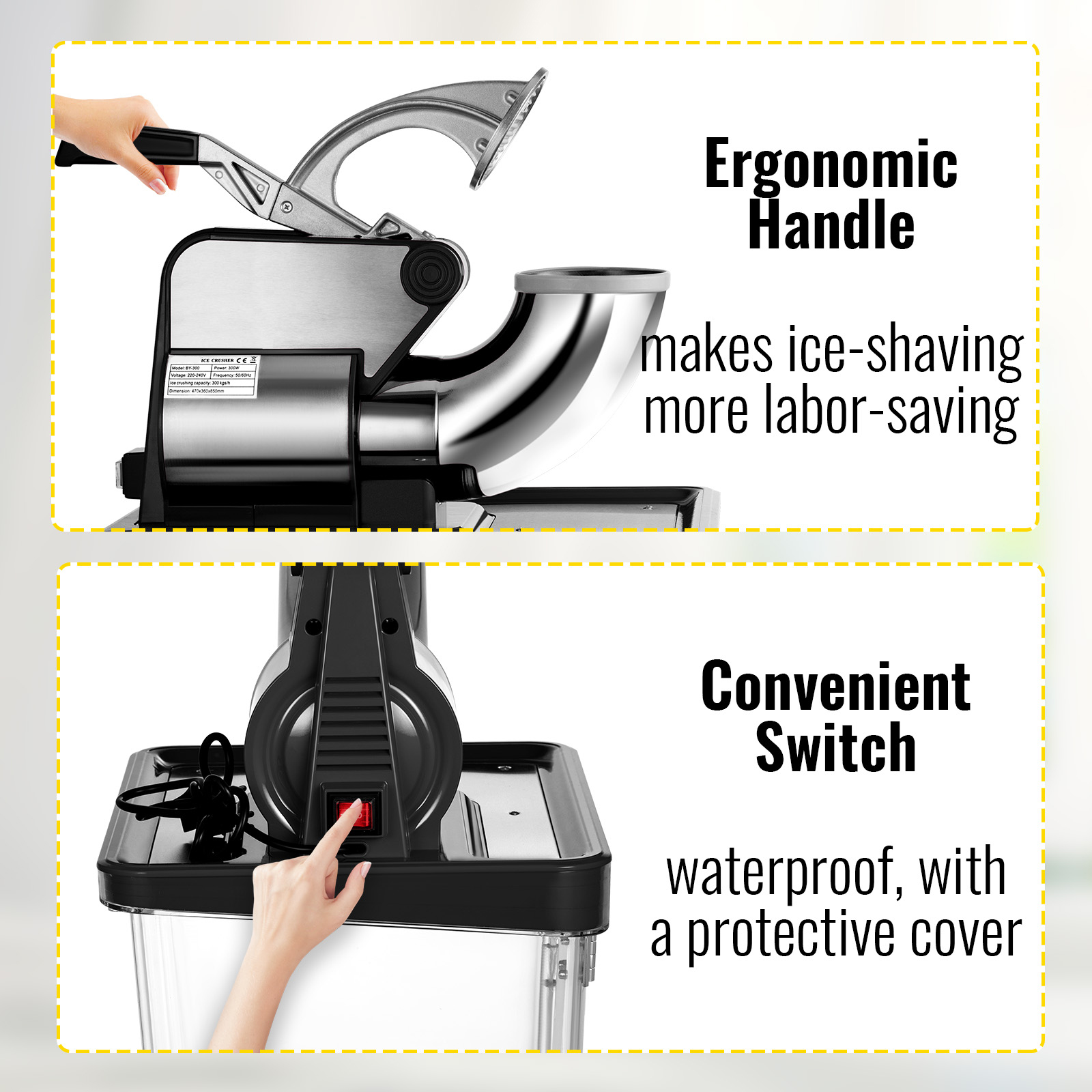 Our electric ice shaver features an eyes-pleasing appearance and powerful performance. With the built-in 300W copper motor, it can crush 396.8 lbs (180 kg) of ice each hour, providing you with soft, fluffy, and powdery snow ice and meeting your demands in a relatively short time. Considerate design details and accessories are also integrated, such as the integrated storage box, wide ice inlet, ergonomic handle, waterproof switch, non-skid feet, etc. It is perfect for restaurants, canteens, bars, cafés, snack stands, etc.