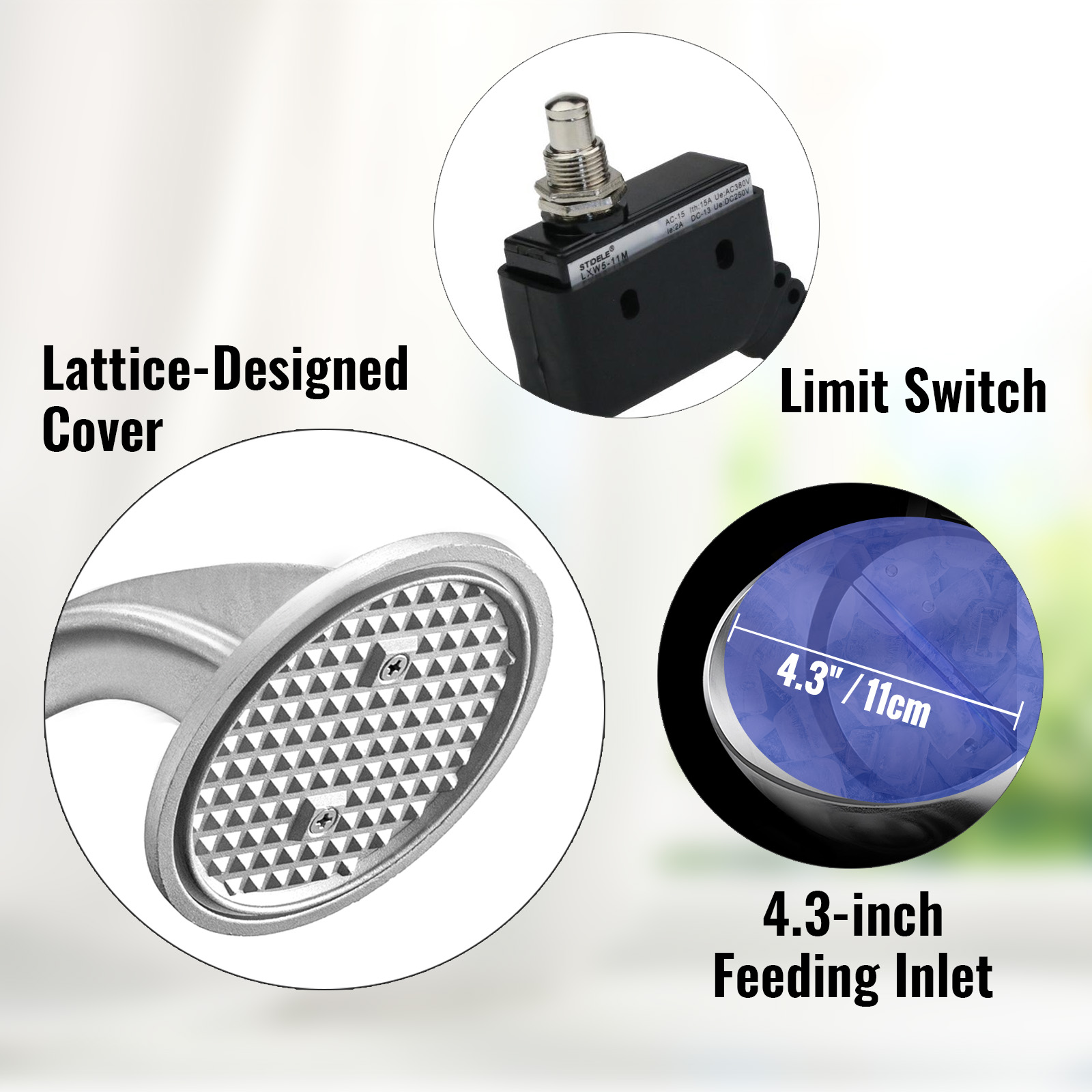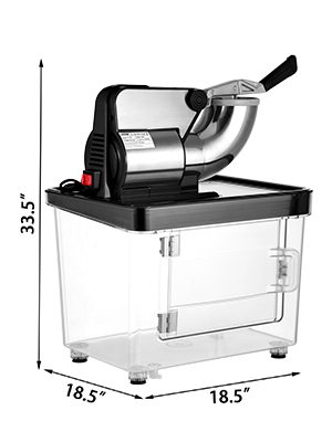 This snow cone maker features an extensive ice inlet barrel, the diameter of which measures 4.3" (11 cm). You can put in tiny ice cubes or large ice blocks. The more ice you load at each time, the more crushed ice you will get. The lattice-designed cover increases the contact area and avoids splashing.