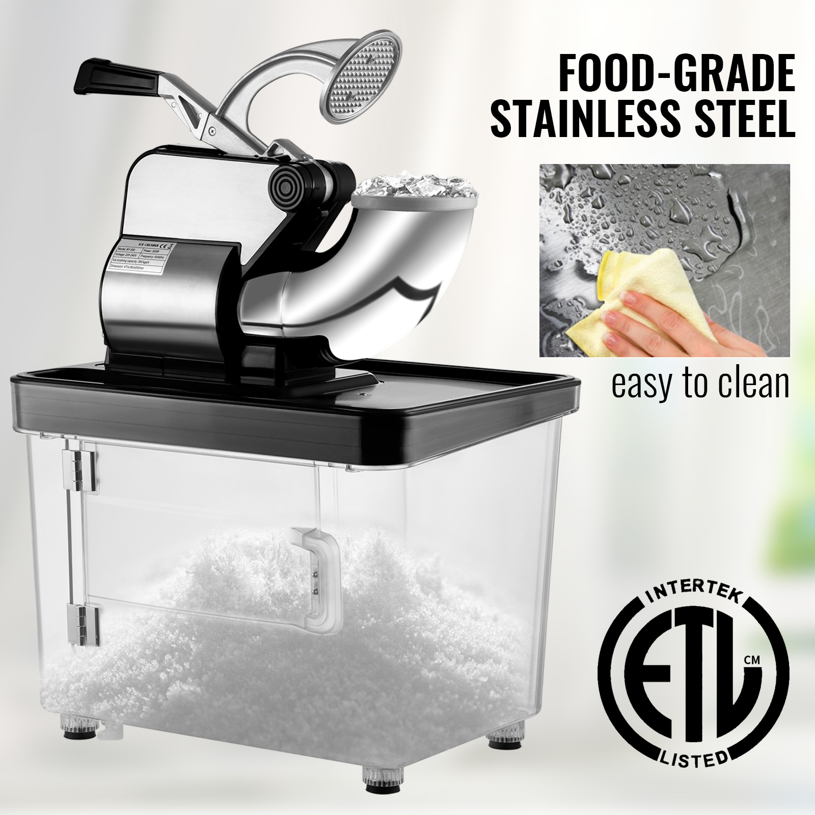 Our machine is ETL certified. All the parts contact with ice adopt food-grade stainless steel, easy to clean. An extra-large storage box is integrated below, 18.5"x14.2"x14.2" (47x36x36 cm) in dimensions and 9 Gal (34 L) in capacity, large enough for holding the falling crushed ice.