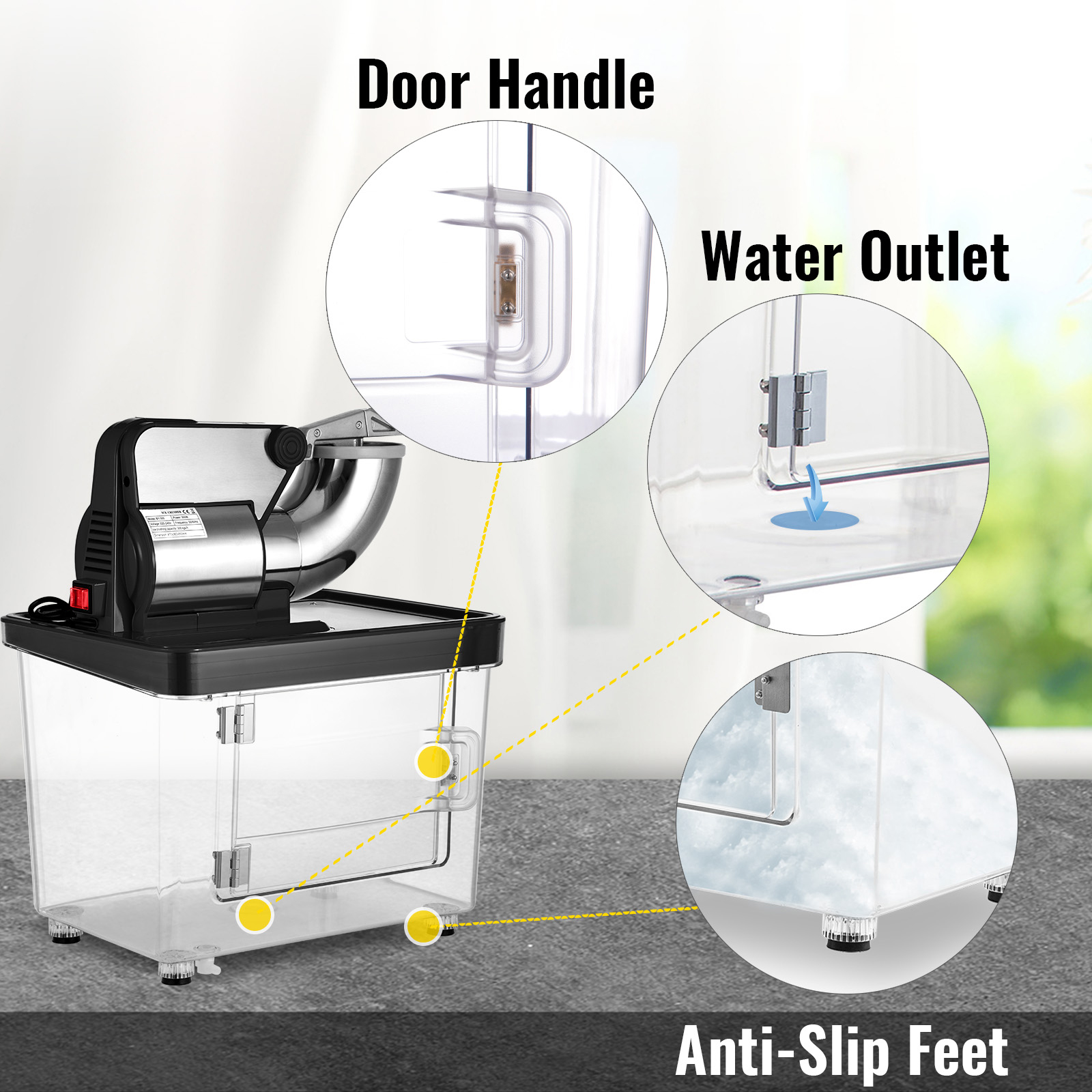 The door handle is convenient to open and take out the shaved ice. The water outlet below serves to discharge the melted ice timely. And the non-slip feet will stabilize the machine during working.