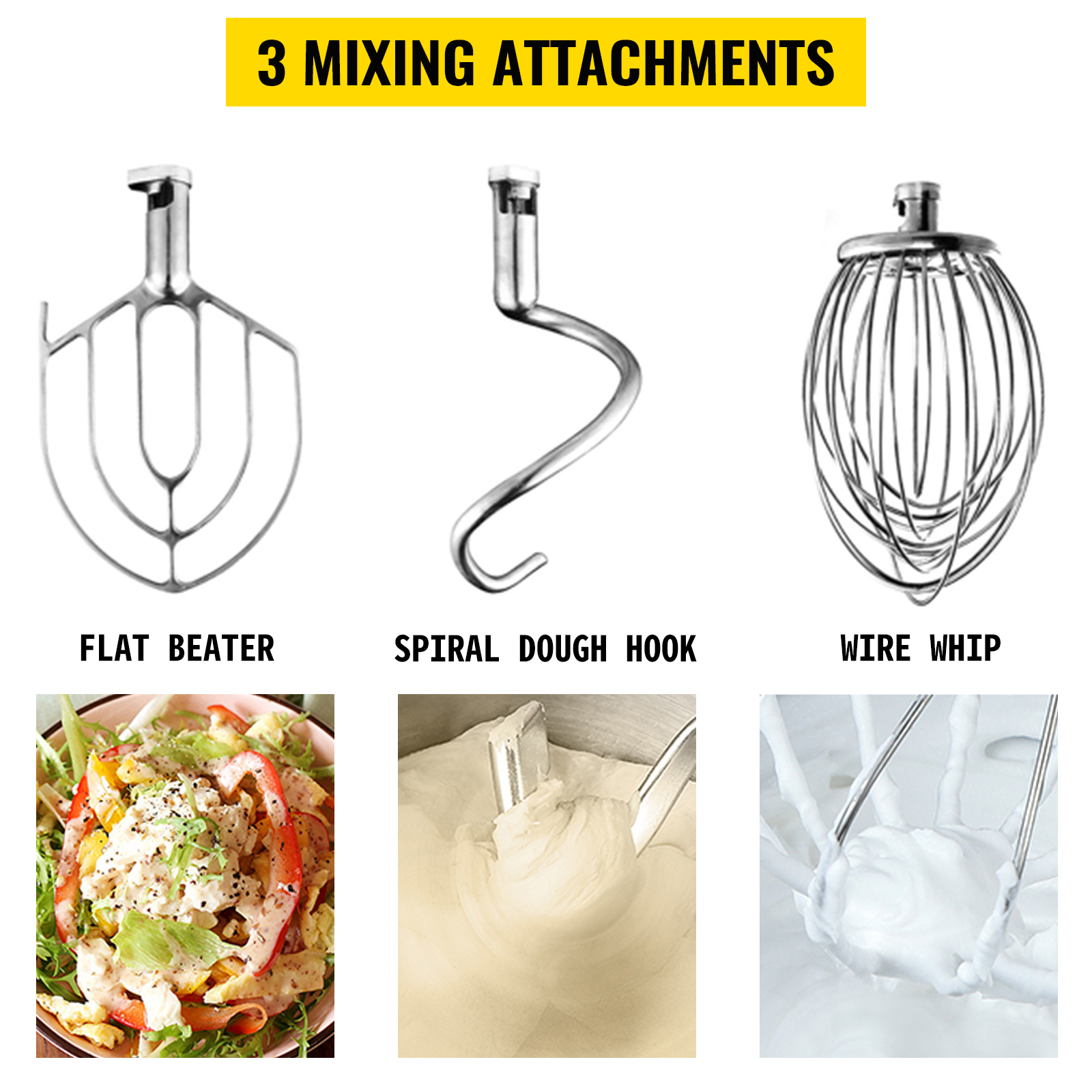 This industrial mixer comes with three interchangeable attachments: a spiral dough hook, a flat beater, and a wire whisk. These tools are specifically crafted to handle a variety of food mixing tasks with ease.