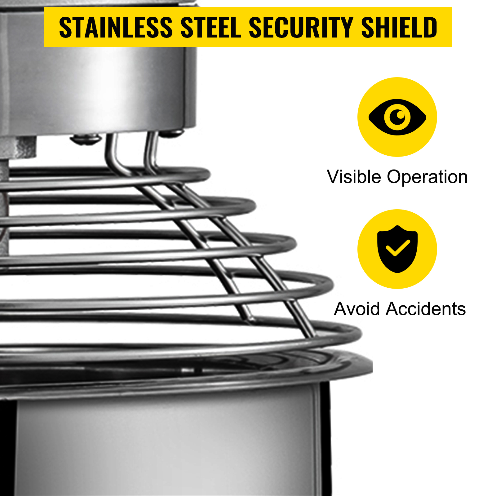 A stainless steel bowl safety shield is designed to minimize ingredient splashes and prevent larger items from accidentally entering the bowl, all while allowing you to monitor the contents inside.