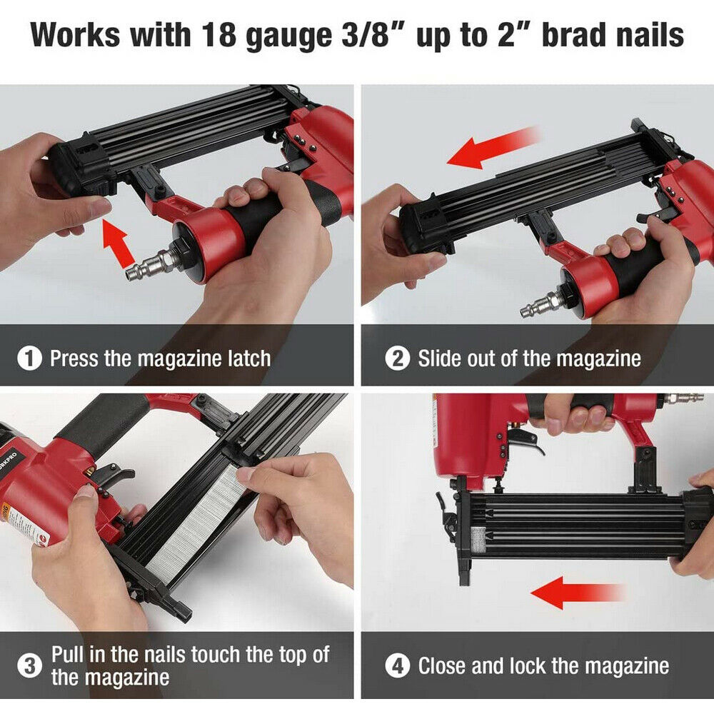 This WORKPRO 18-Gauge Pneumatic Brad Nailer Compatible with 3/8” up to 2” Nails.