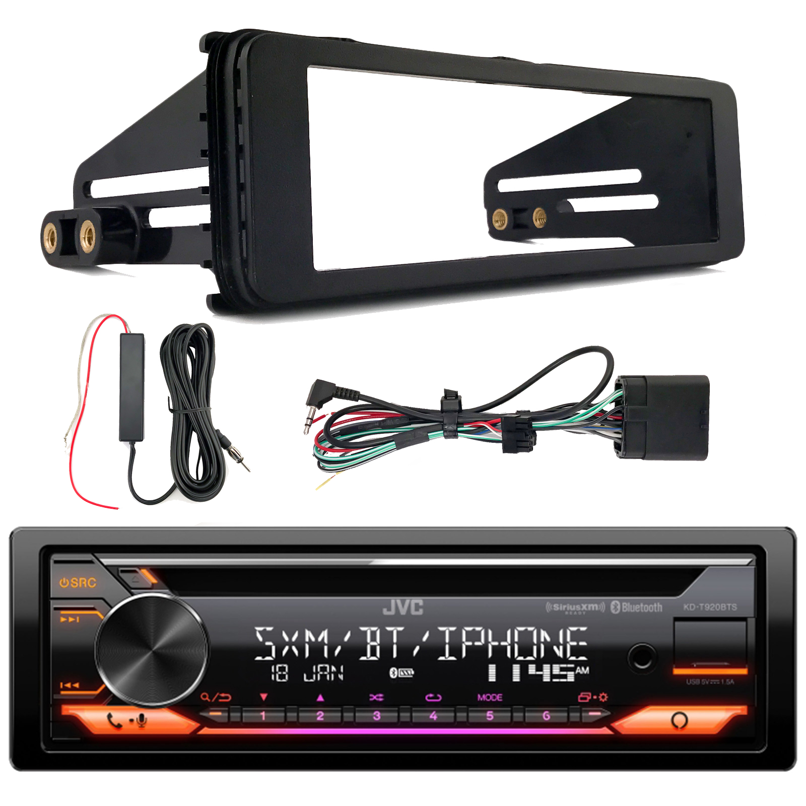 JVC KD-T920BTS Single DIN AM/FM Stereo USB AUX CD Player Bluetooth Multimedia Car Audio Receiver, Enrock 98-2013 Harley Single Din Installation Kit, Antenna Signal Reception Amplifier Booster Kit