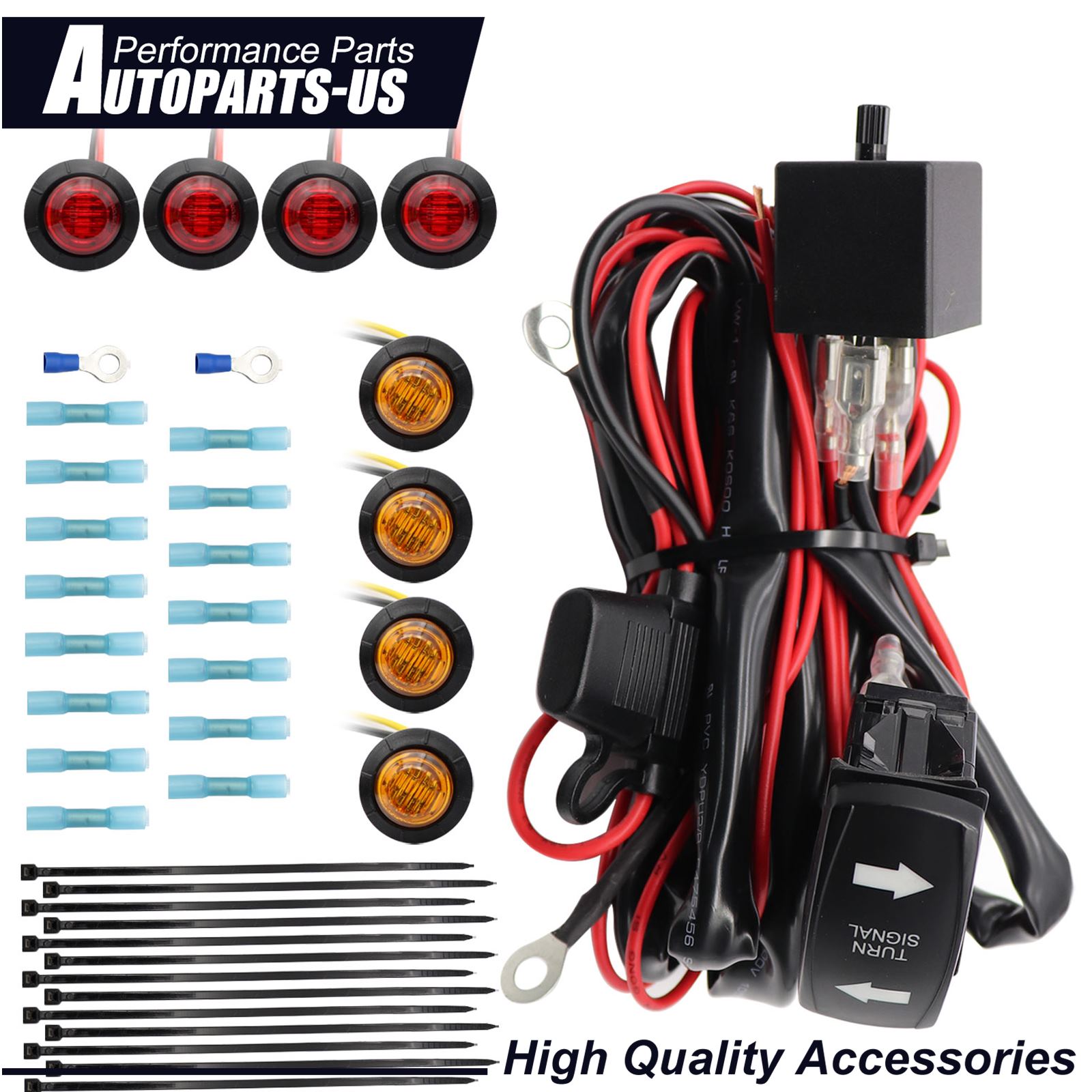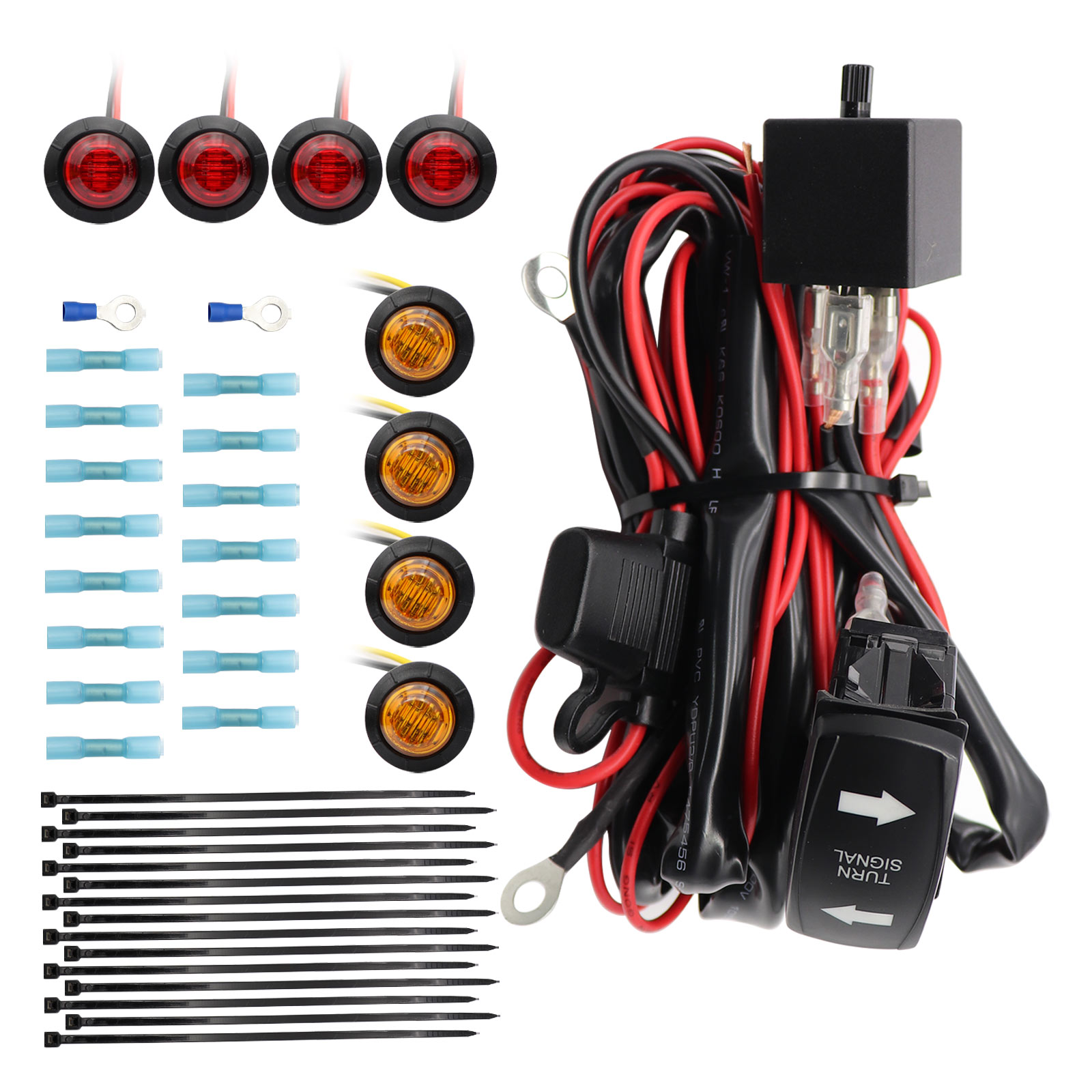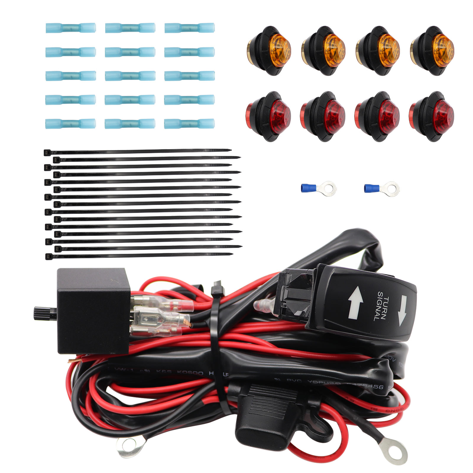 UNIVERSAL ROCKER SWITCH TURN SIGNAL KIT -including amber / red turn signals, 12V 40A flasher relay, prewired wiring harness, 40 feet of matching color coded black/white bonded wire and power wires. No modifications needed and make installation simple and look like factory installed control.