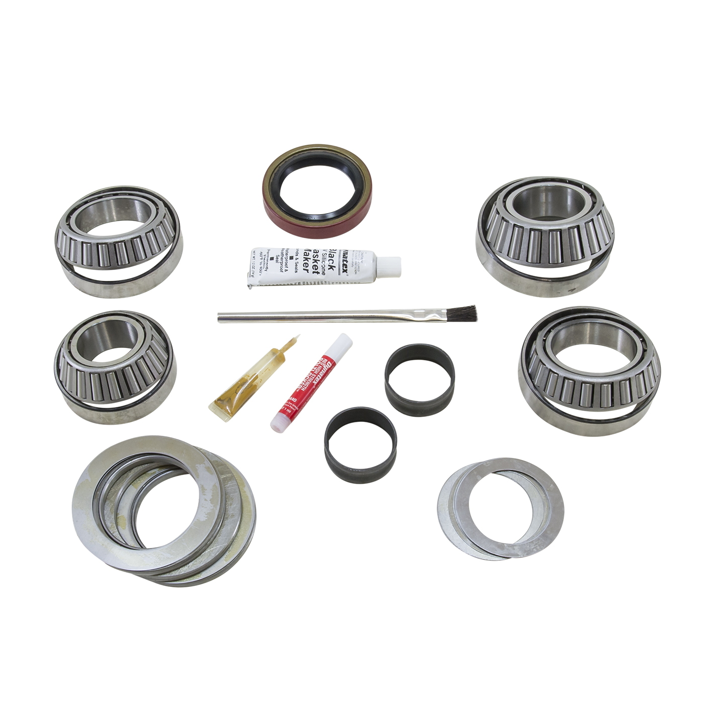 Yukon Master Overhaul kit for GM 8.75" differential Yukon Master Overhaul Kits give you all the high-quality parts you need to start and finish every differential job. Yukon offers more tailor-made kits than any other manufacturer in the industry to meet your specific installation needs. This kit uses Timken bearings and races along with high quality seals and small parts. Yukon Master Overhaul Kits are the most comprehensive and complete kits on the market because Yukon does extensive research to ensure that every kit has everything you need for your application. Included are Timken bearings and races along with high quality seals and small parts. Included in this kit are carrier bearings and races, pinion bearings and races, pinion seal, complete shim kit, ring gear bolts, pinion nut, crush sleeve, thread locker, marking compound with brush, and silicone. Fits GM 8.75"