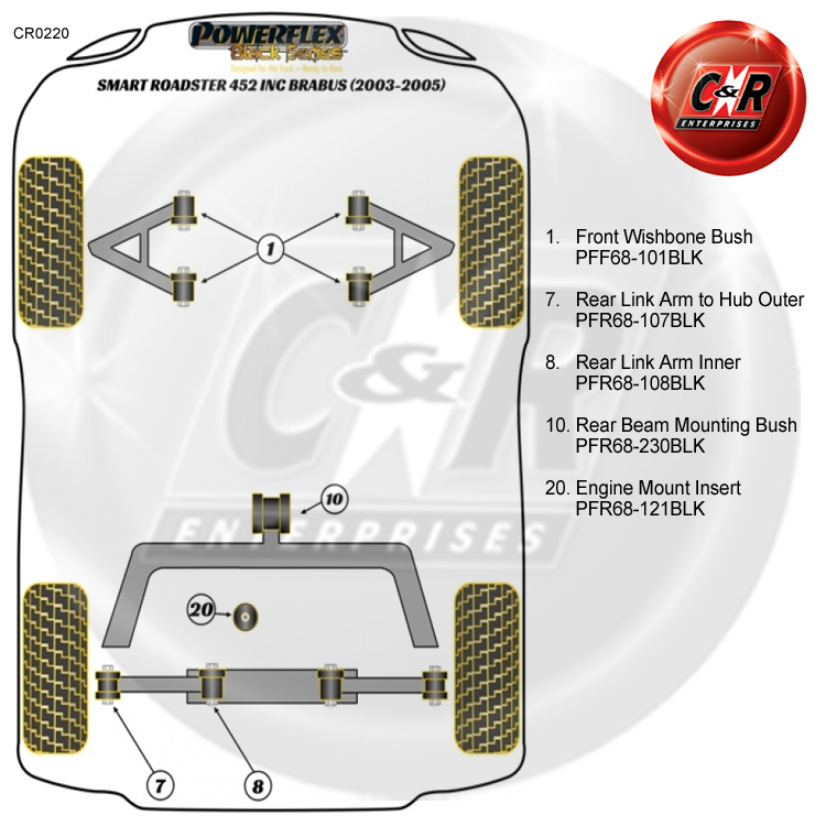 Um die richtige(n) Powerflex-Buchse(n) zu identifizieren, die Sie benötigen, sehen Sie sich bitte das Positionsdiagramm weiter unten in der Auflistung an.