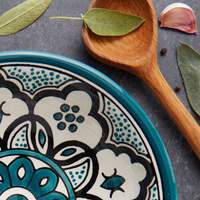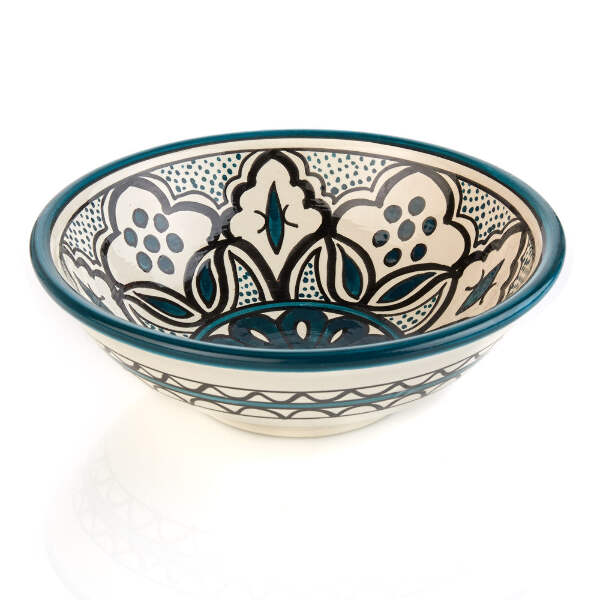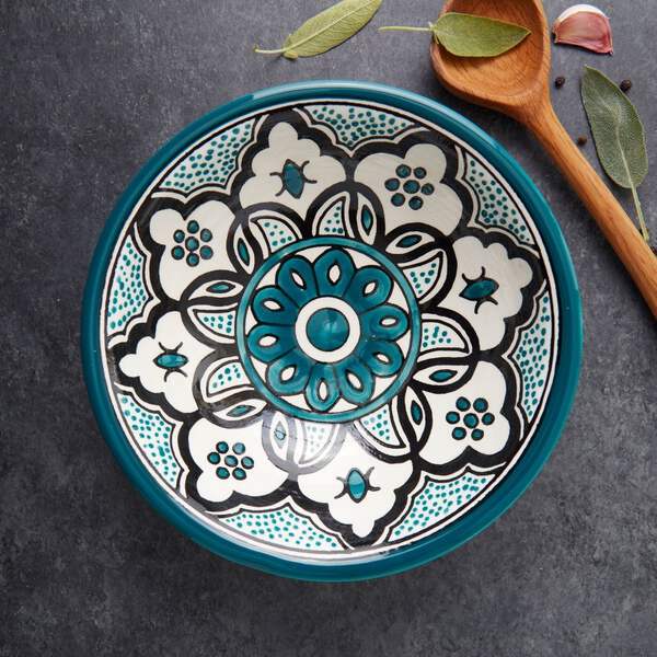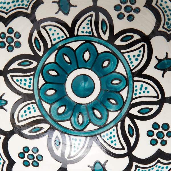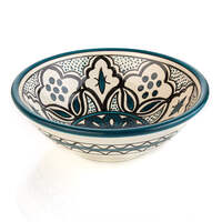 * Small round ceramic bowl. * 8.5" diameter, 2.75" height. * Teal, black, and white colors. * Bold patterns. * Glazed finish. * Handmade pottery. * Hand painted. * Microwave and dishwasher safe. * Slight color and paint variations may occur due to handmade technique. * Made in West Bank, Palestine. --------------------------------- Ceramics hand painted in vibrant floral patterns are a signature craft of palestinian pottery. Palestinian pottery is one of oldest traditional art that still remains today. Archeological discoveries in Palestine have found pottery that date back 5000 yrs ago. The art has been passed down from one generation to another. Ceramics are made in family workshops with fathers and grandfathers teaching their sons. Each ceramic is made in a three step process and takes over a week. First the ceramic is shaped, dried and smoothed. The drying takes place in a 1000 degree oven for a day. During the second step, each ceramic is first painted with a design outline in black and then the colors are filled in. After the ceramics are colored and dried, they move to the final step. The final stage is hand dipping the ceramic in a clear glaze and firing. All ceramics are safe for use in microwave and dishwasher.