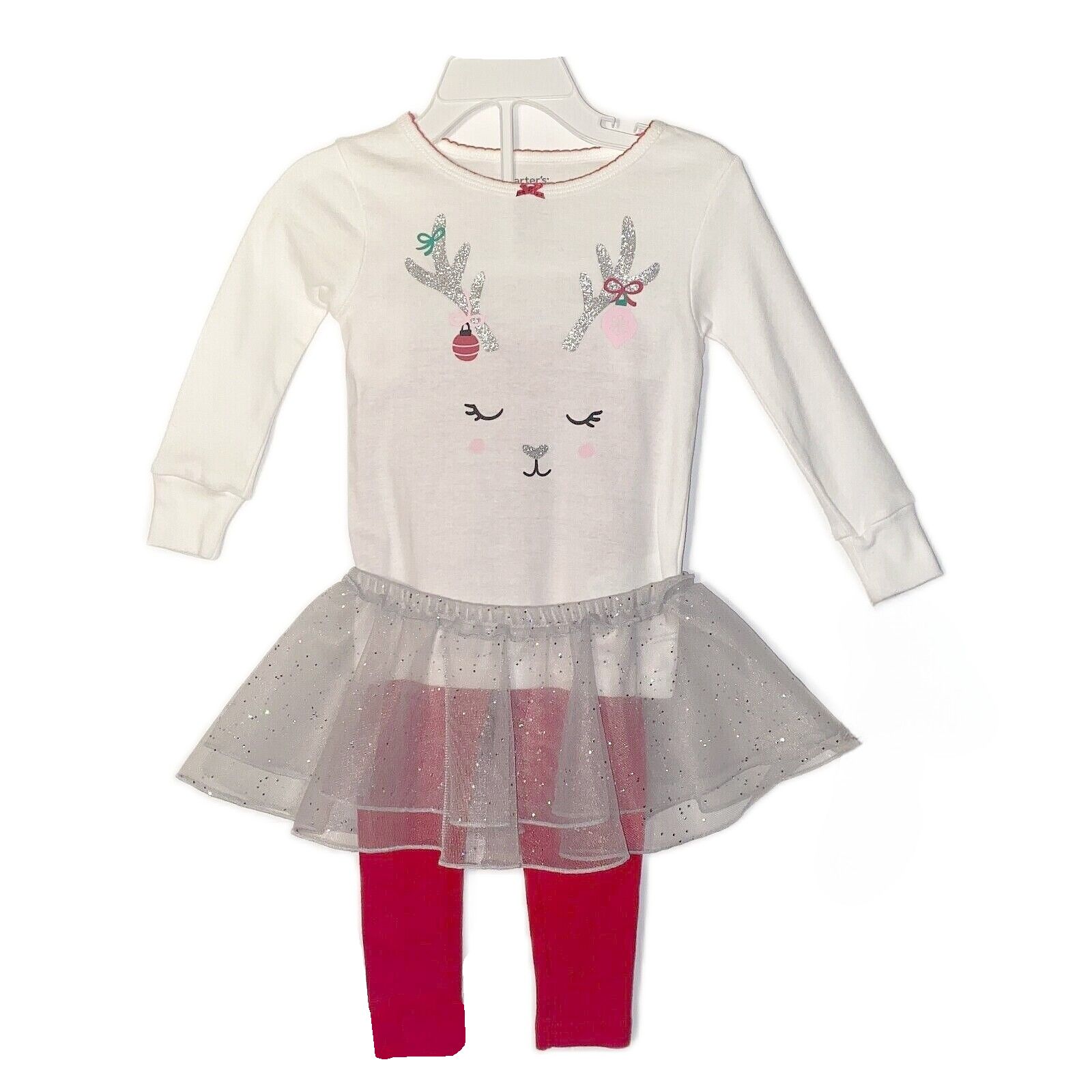 Get her ready for the holidays in this festive 3-piece set, featuring a snug-fit cotton top and bottoms, and a detachable tulle tutu! A super cute and colorful Reindeer applique adorns the pajama top, while the picot trim and red satin accent bow add to the charm. Coordinating print pajama pants with an elasticized waistband for a custom fit. A detachable red tulle tutu completes the set.