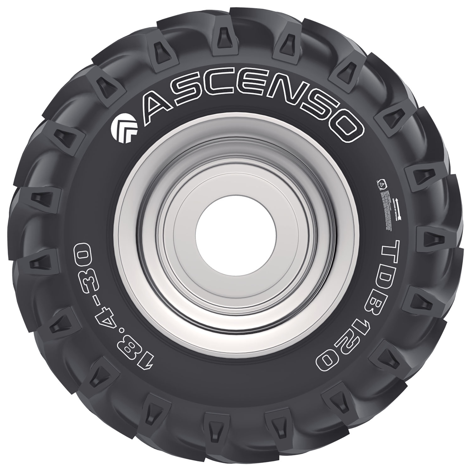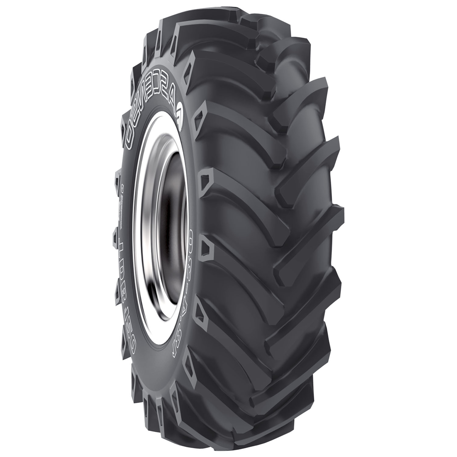 A tubeless agricultural tire, the Ascenso TDB120 is designed for use on tractors and features an R-1 tread pattern with wide lugs that dig into soil to increase traction while also promoting self-cleaning for consistent grip. A sturdy sidewall guards the tire against cuts, chips, and abrasions, and the TDB120's strong nylon carcass boosts strength and durability for a higher load carrying capacity and to reduce downtime.