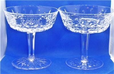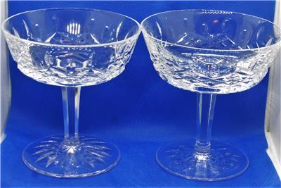 This is a nice set of 2 Waterford lead crystal glass champagne or sherbet glasses in the Lismore pattern. Measures approx 4-1/8" high, I find no chips, might have some scuffs. Signed on the bottom.
