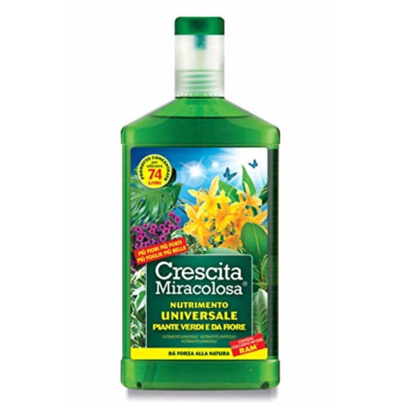 Crescita Miracolosa piante verdi e da fiore è il nutrimento per piante a base di speciali sostanze e molteplici microelementi che compongono il fattore RAM (Regolatore Attivatore Metabolico), grazie al quale sono in grado di essere assimilati più facilmente dalle piante. Con Crescita Miracolosa piante verdi e da fiore le piante ottimizzano il loro ciclo vitale e, in poco tempo, diventano vigorose e più resistenti alle malattie ed ai parassiti: i germogli, le foglie, i fiori sono molto più numerosi, le foglie più carnose e fresche, con colorazione profonda ed intensa, i fiori più grandi e rigogliosi. Crescita Miracolosa piante verdi e da fiore migliora il metabolismo cellulare, aumentando così la durata della vita di ogni pianta.