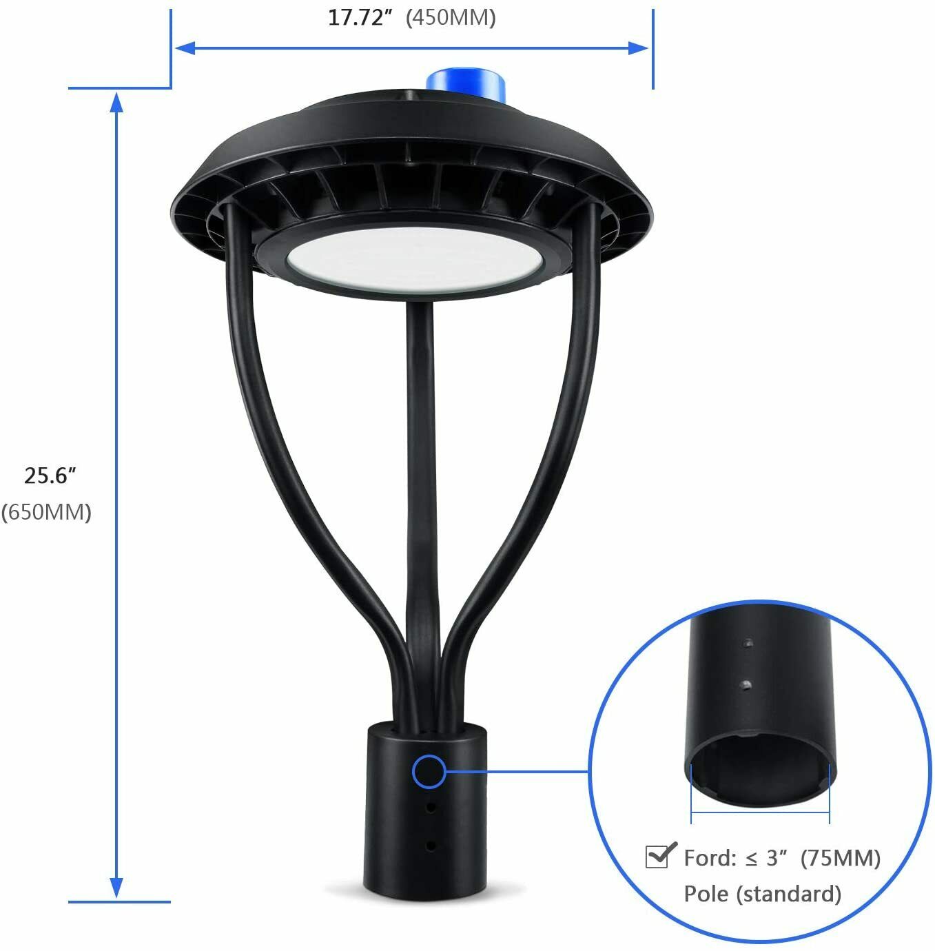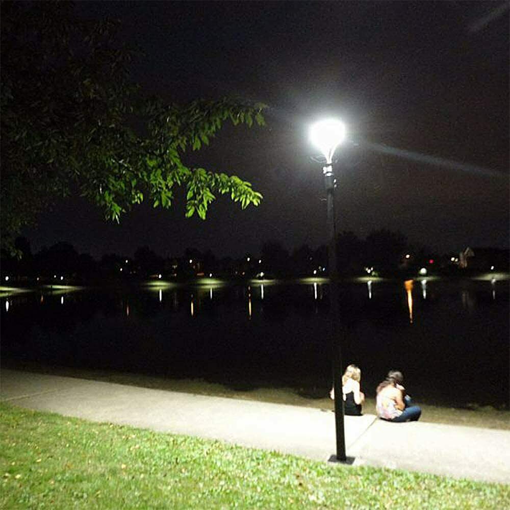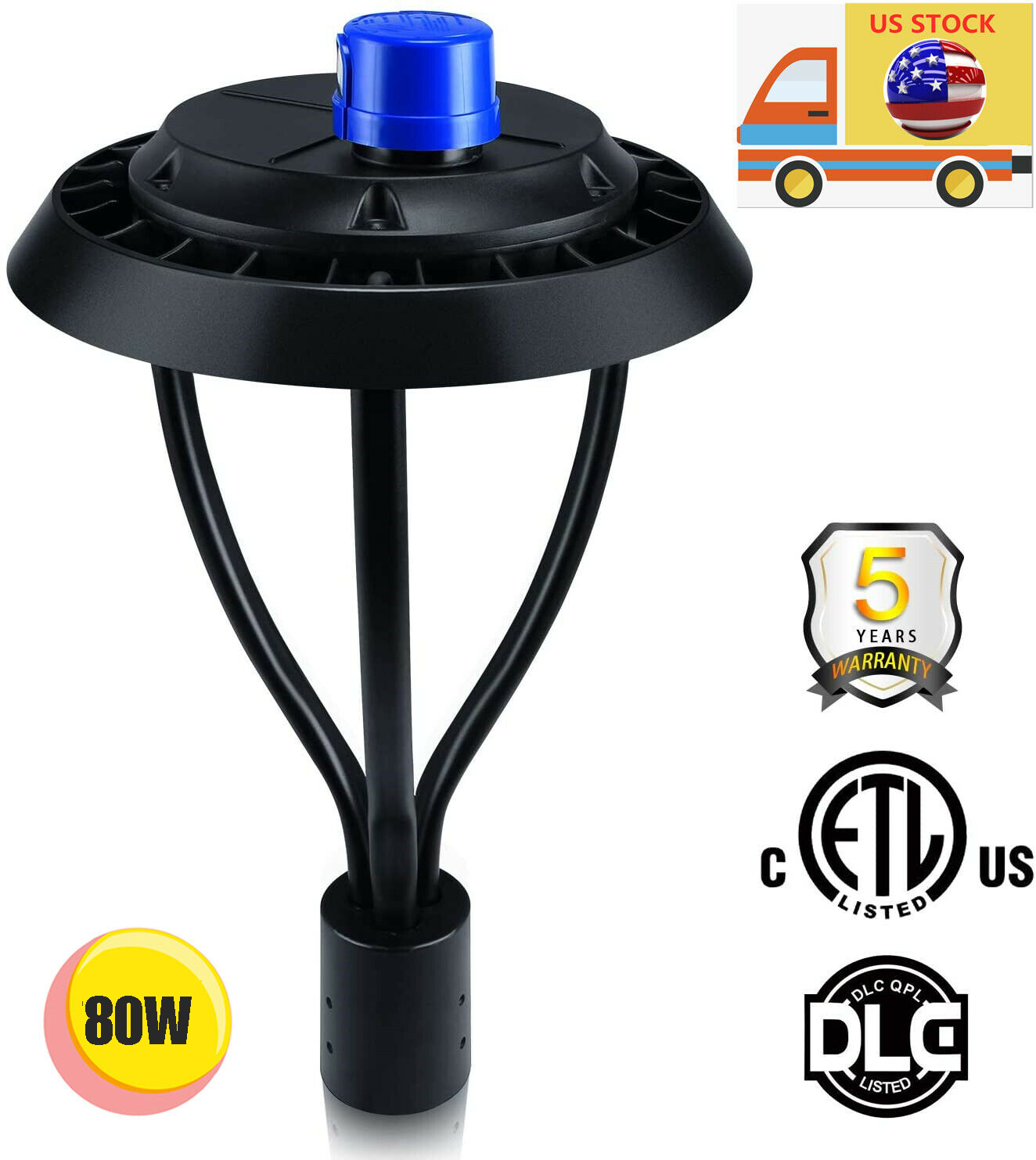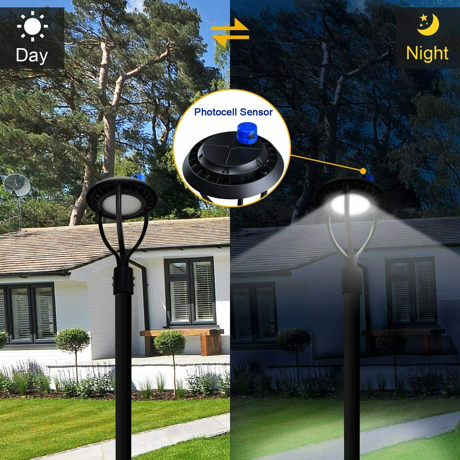 80W Led Post Top Light with Photocell Outdoor Street Yard Circular Pole Lighting LED Post Top Light Fixture 80W With Photocell Roadway Area Pole Lighting 5000KSize:80W-10125Lumens-With Photocell Light Up Larger Area - The 80w light post bring 10125Lm with SMD3030 chips, up to 140lm/watt, AC 100-277V universal voltage and 120°beam angle. 5000K color temperature of lighting is a nice choice for street light illumination. Anti-shock, anti-moisture, no glare, no strobe light, no ghosting, protecting your eyes. Dust to Dawn Photocell - The Led circular post top pole light comes with photocell sensor outside automatically turns ON at sundown/night and light post at sunrise/daytime with dusk to dawn, high power factor >0.9, more than 50000hours lifespan, reduce your electricity consumption, save your electronic bill. Provides a continuous, efficient outdoor lighting environment. Commercial Grade Material - The DLC/ETL Listed post pole light fixture made of die-casting aluminum body + protective glass cover. The scientific design helps the exterior light post top to dissipate better, achieve the best use of the led lighting post. IP65 waterproof for drying, wet environment, sandstorms, snowstorms, and harsh weather conditions. Wide Application - The circular post top design give the lamp a uniform brightness and can be applied to a variety of outdoor scences, such as pathway, street, front yard, city expressway, trunk/rustic road, factories, playground, school, garden, courtyard, parking lot, public park, walkway, exterior, driveway, store, farmyard or any other commercial and industrial area.