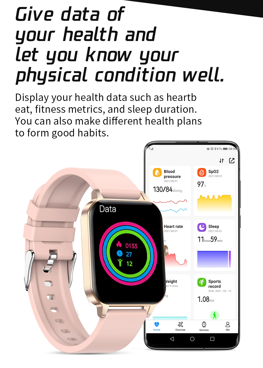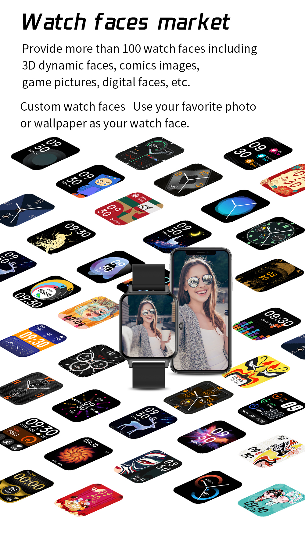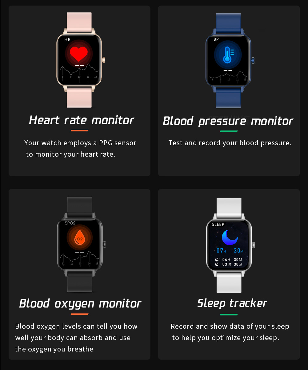 More functions:Life Assistant weather, calculator, stopwatch, timer, alarm, camera remote, control music playback, lock screen password, share health data with families, turn Wrist To Wake.