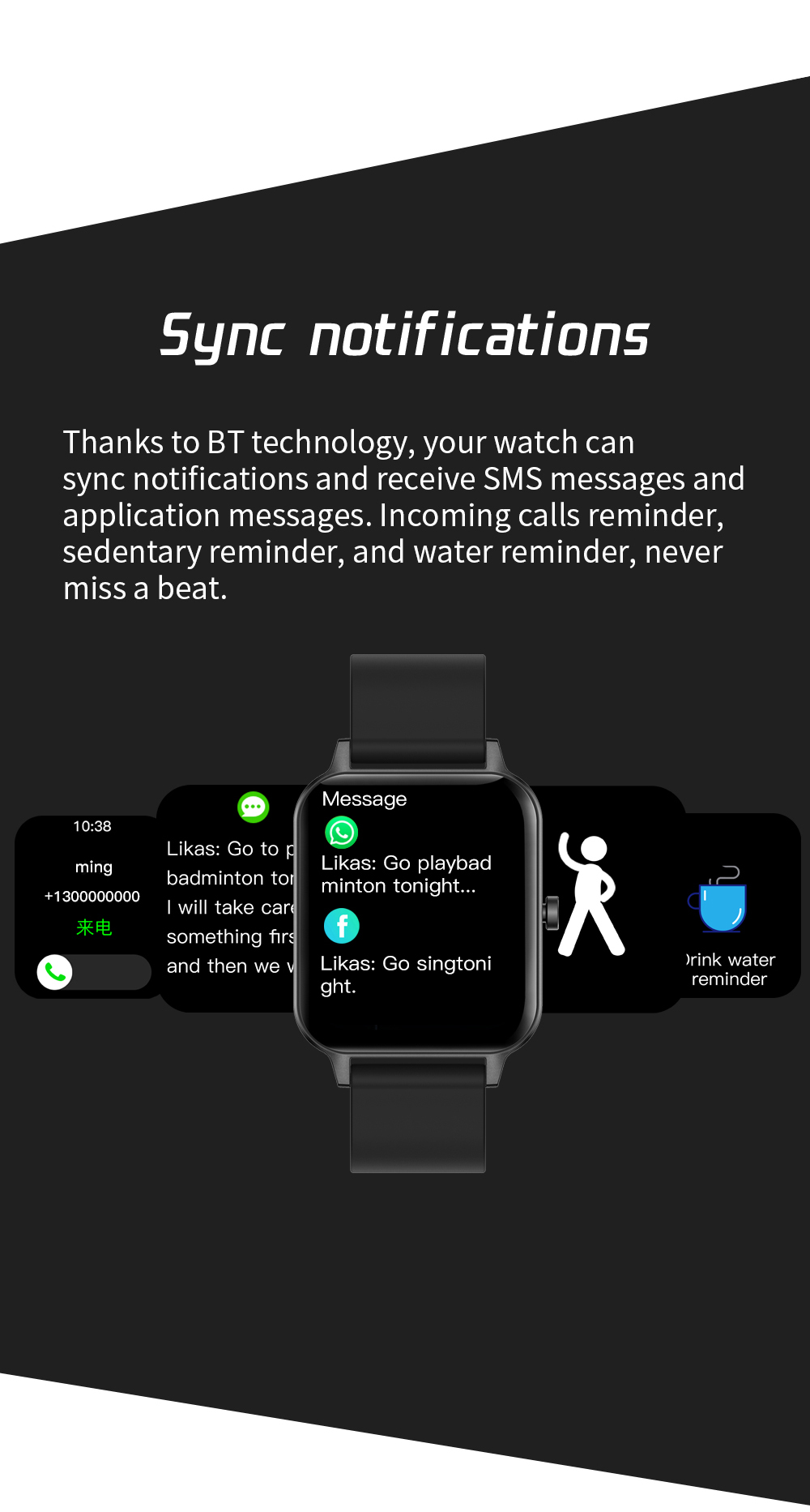 Sync Notifications: Notifications for information, incoming calls, and SMS messages, sedentary reminder, water reminder
