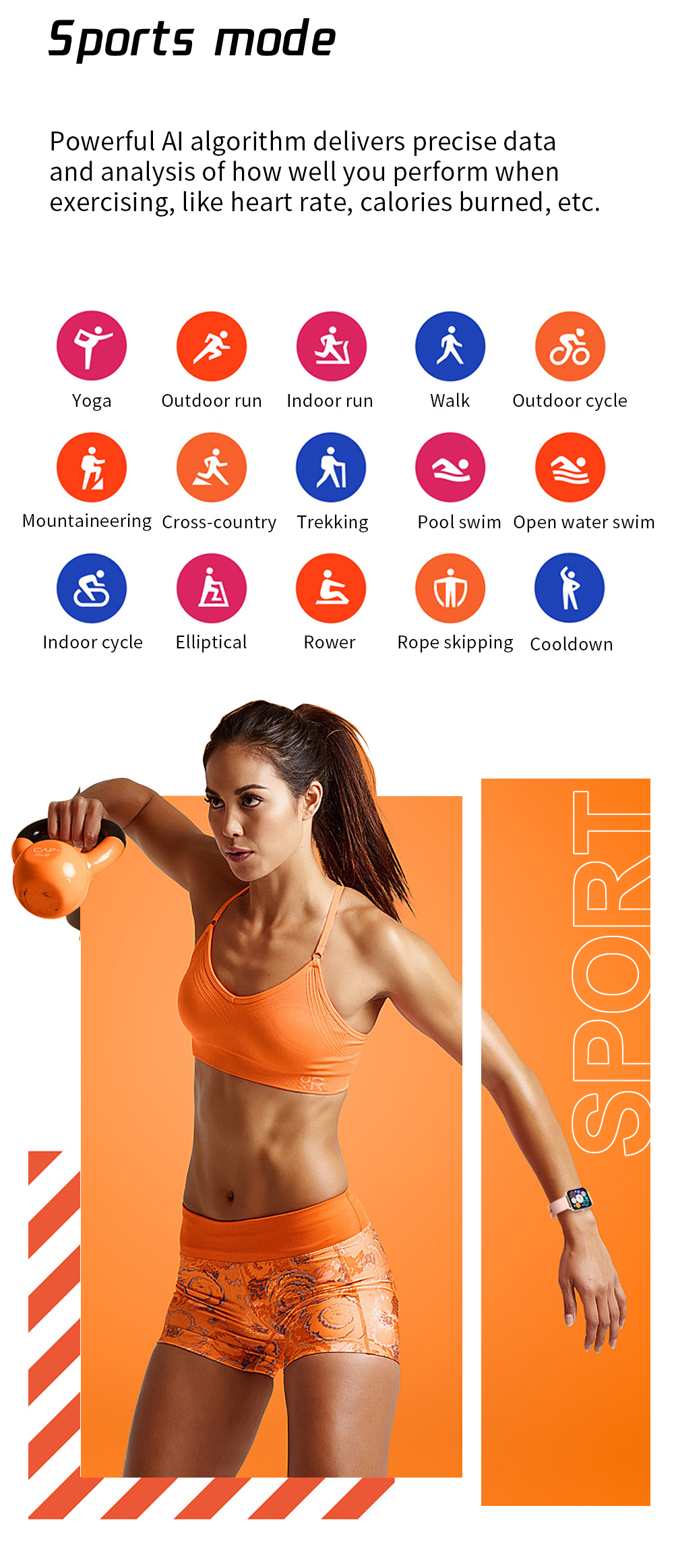 Fitness Tracker: Pedometer, calories burned, distance, sports mode (13 sports: cycle, swim, run, mountaineering, walk, etc.)