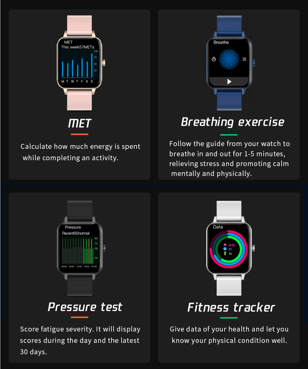 Function:Health Monitor: Heart rate/blood pressure/blood oxygen monitor, sleep tracker, MET, breathing exercise, pressure test, record health data