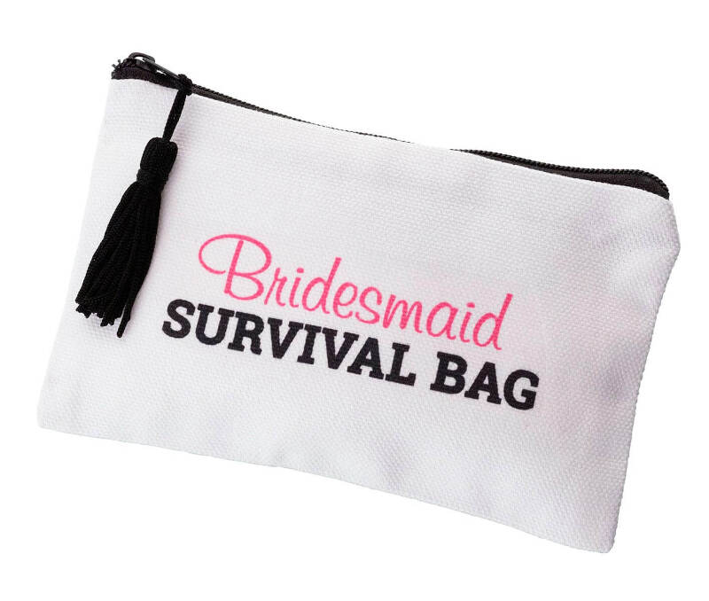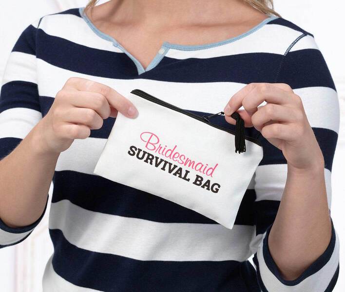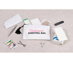 All her wedding day essentials for those little emergencies can be found in this bridesmaid survival bag. Bridesmaids can be prepared for anything with this survival kit close at hand. Survival kits are great gifts for your bridesmaids. Contents included in this canvas survival bag: 1 sewing kit, 1 pair of Tweezers, 2 bobby pins, 2 safety pins, 1 travel-size Kleenex, 1 nail file, 10 q-tips, 2 Band-Aids, 2 blister pads, 2 earring backs and blotting papers. Survival bag measures 6.5" x 4".