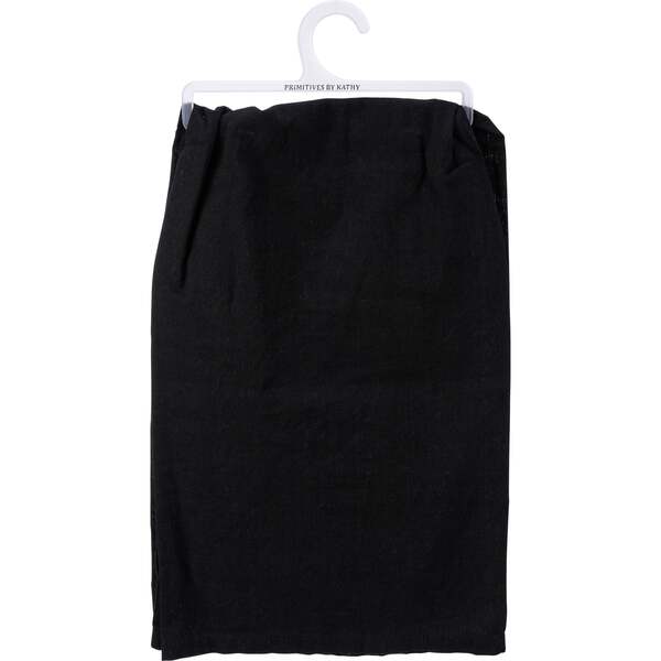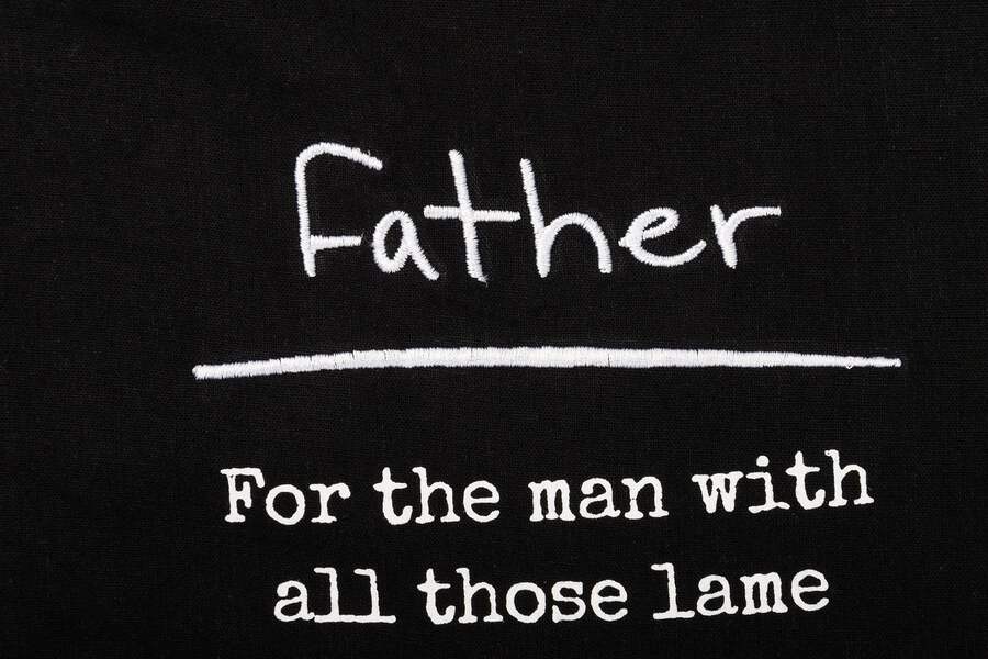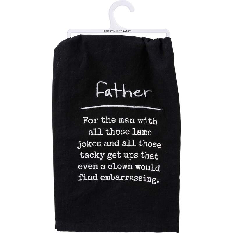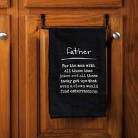 A black cotton kitchen towel featuring an embroidered and printed "Father For The Man With All Those Lame Jokes And All Those Tacky Get Ups That Even A Clown Would Find Embarrassing." sentiment that makes the item feel tailor-made for the fathers in your life. Machine-washable.