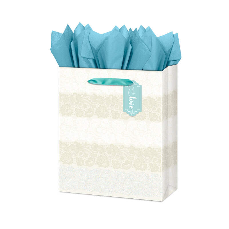 Large Gift Bag - With Love & Lace Dimensions: 10" x 12" Lace Design accented with iridescent glitter Includes coordinating gift tag with sentiment "with love" Satin Ribbon Handles Tissue Paper Not Included