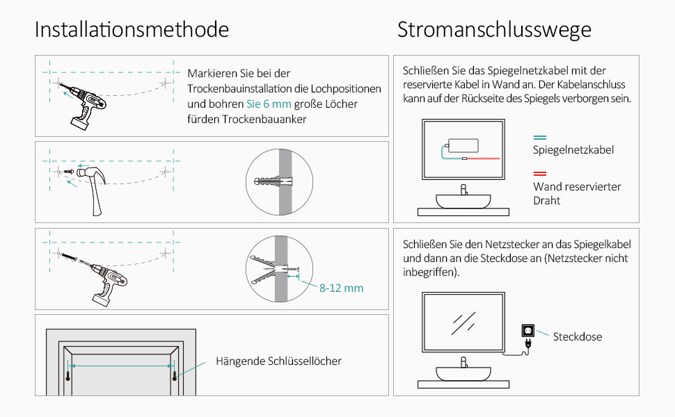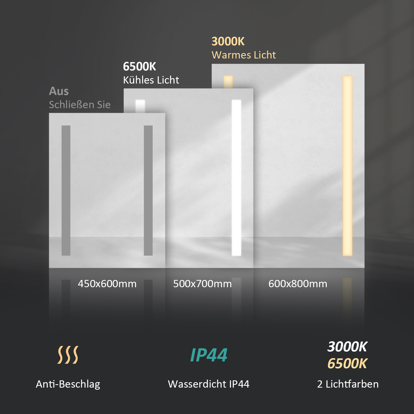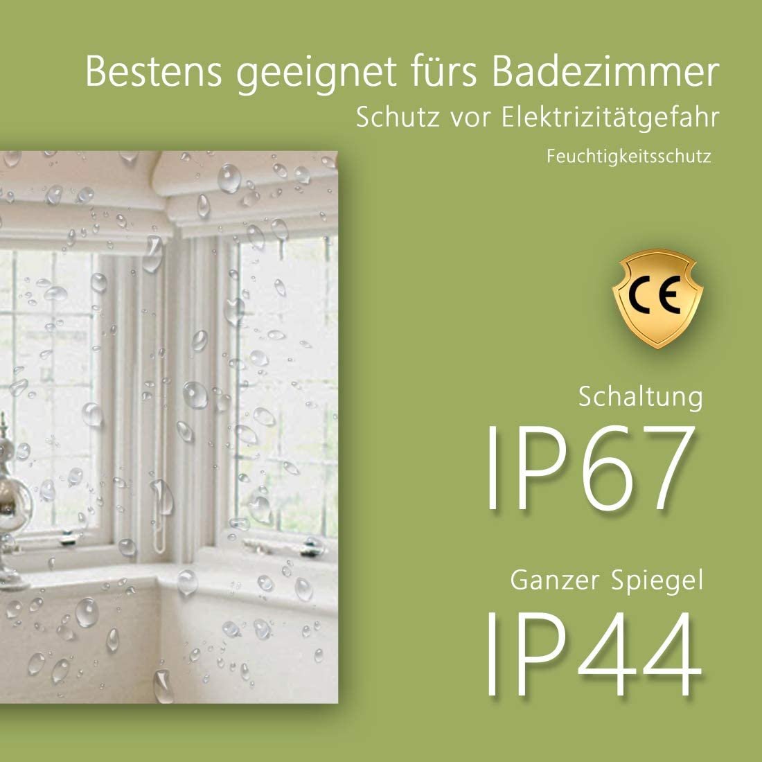 • Feuchtraumgeeignet fürs Badezimmer - Schutzklasse IP44. Der Spiegel ist CE-zertifiziert von Klasse IP44 und die LED Beleuchtung ist auch RoHS-zertifiziert. Dies stellt sicher, dass der Spiegel sicher in der dampfenden Atmosphäre des Badezimmers verwendet werden kann und schützt Sie und Ihre Familie effektiv.