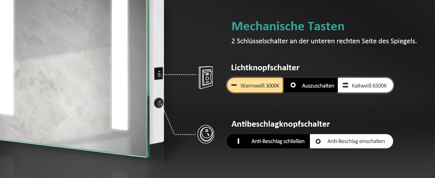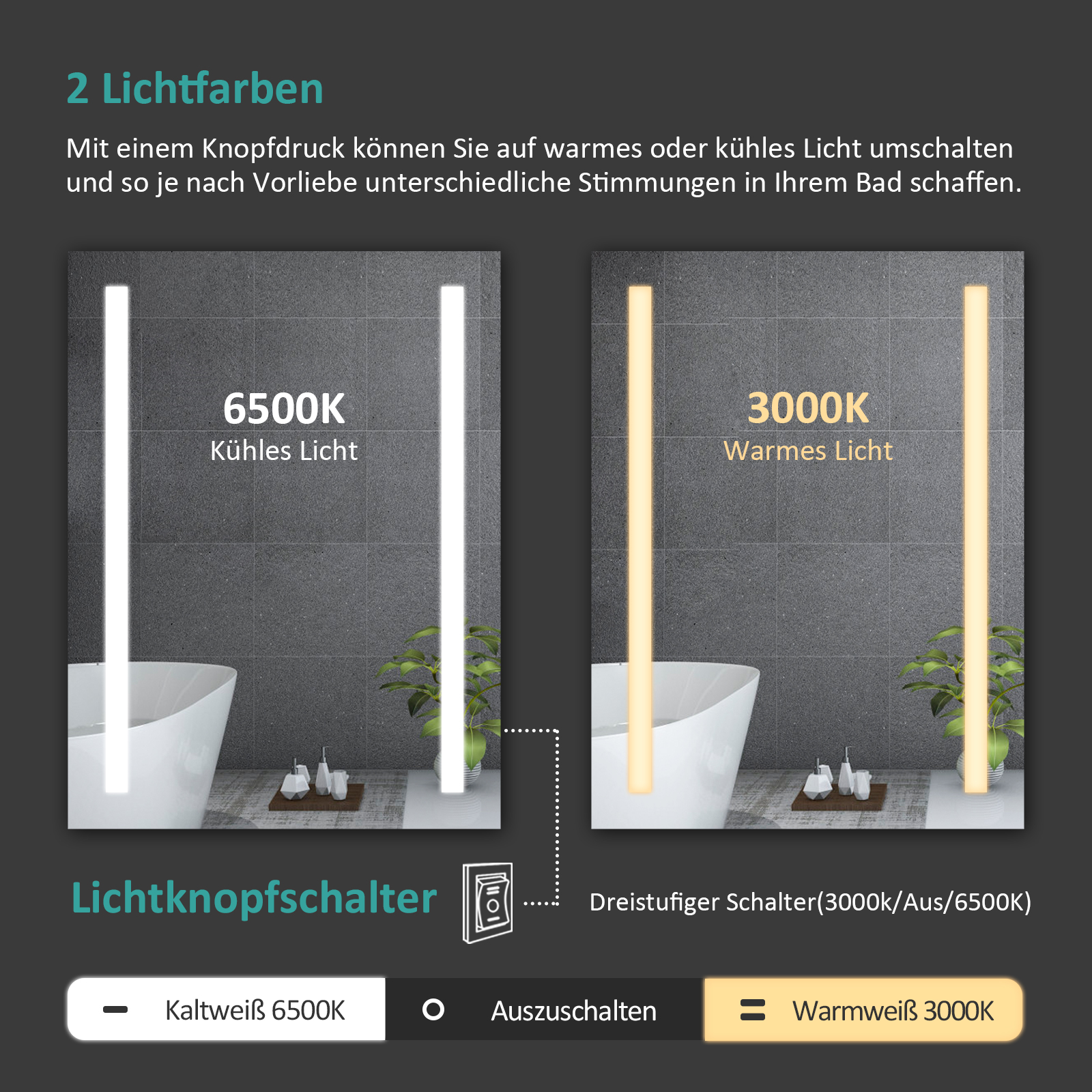 💡【Knopfschalter】Das Badspiegel verfügt über 2 möglichen Lichttemperaturen: Warmweiß(3000K) und Kaltweiß(6500K). Jede Farbe kann mit einem Knopfschalter. Das Licht kann ganz hell oder ganz warm sein, damit Sie in vielen Situationen das Wandspiegel verwenden.