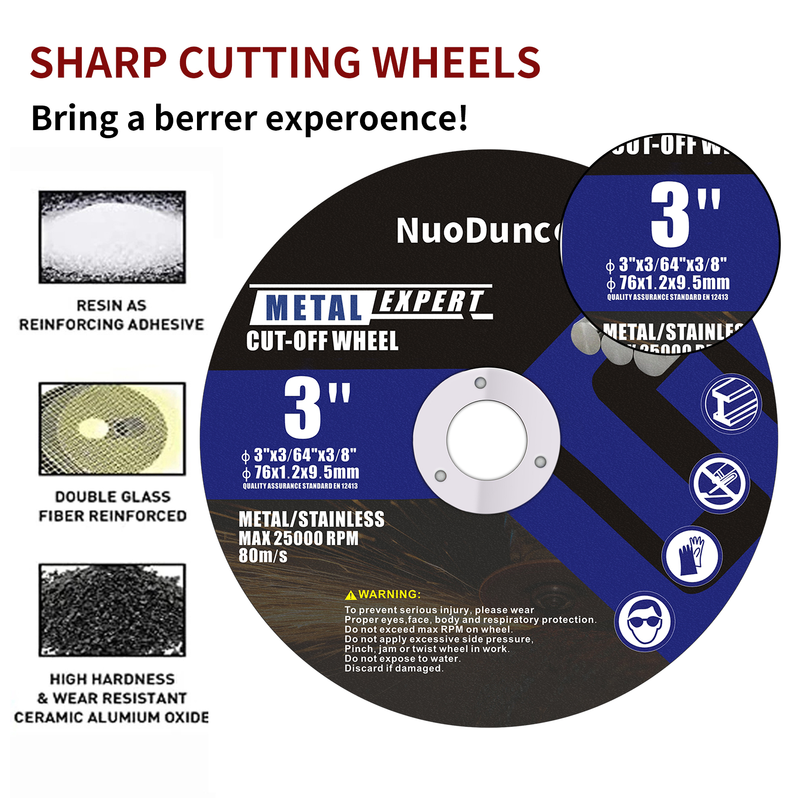·The Cutting Wheels is Thickly inlaid steel ring, anti-rust electroplating treatment of hole ring, firmly inlaid, high safety.